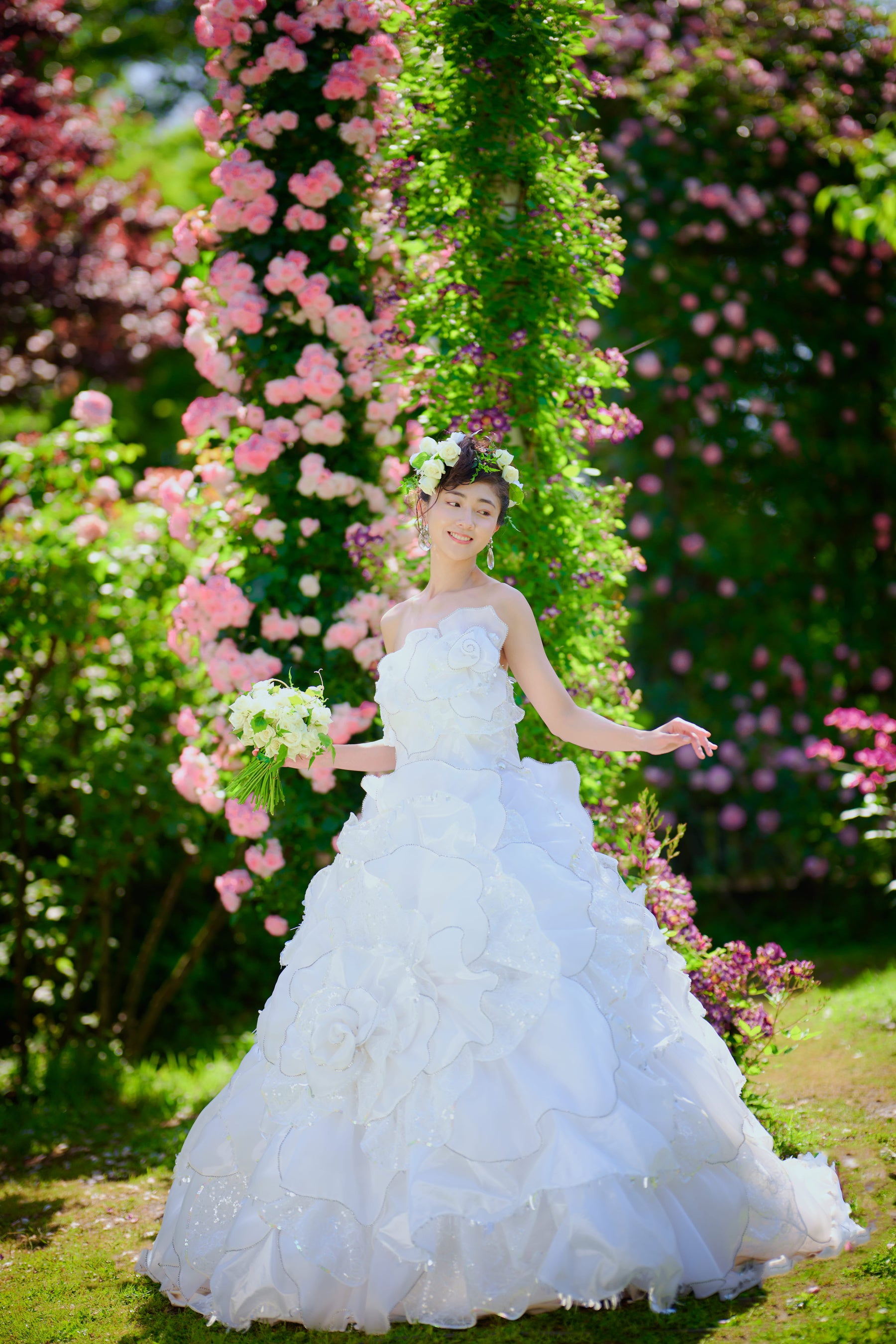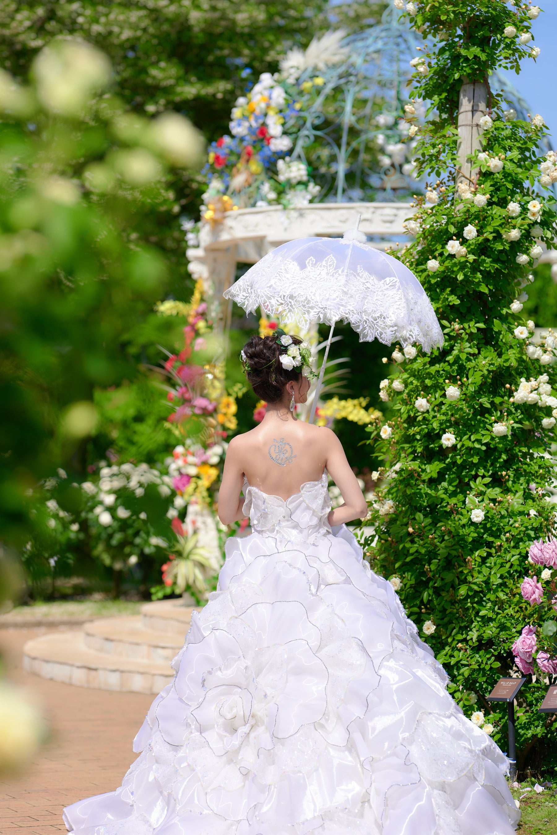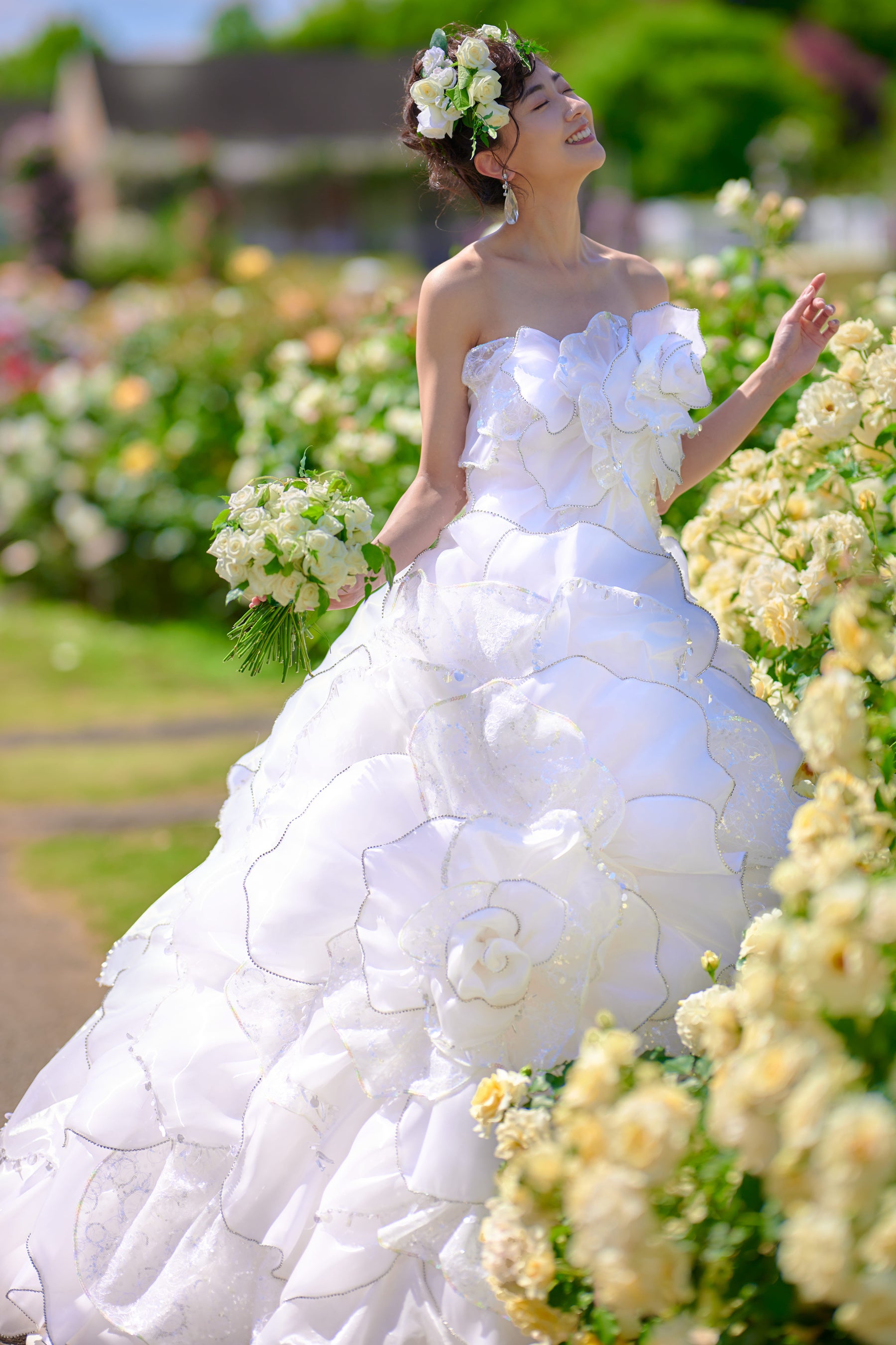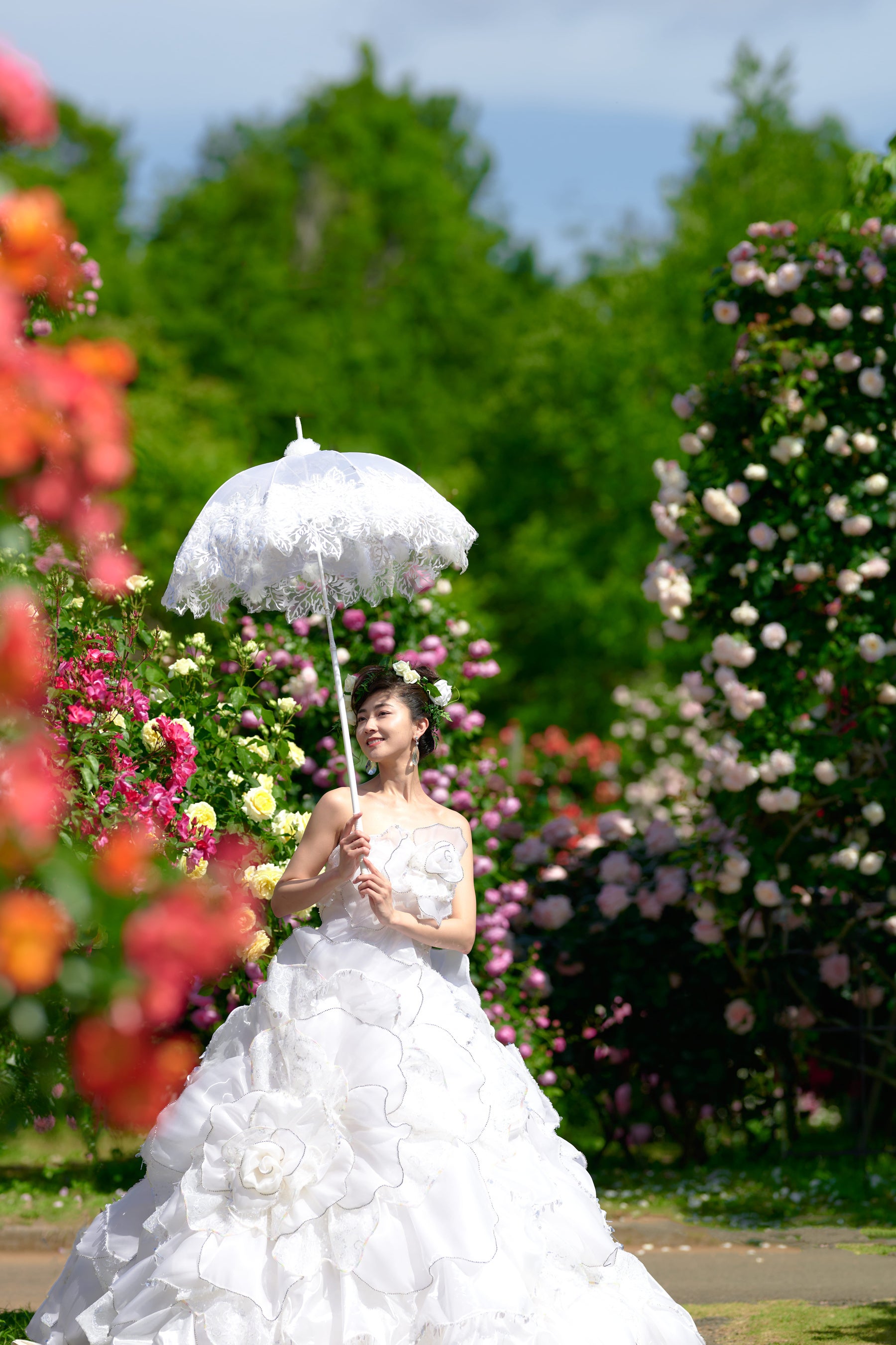 撮影場所は千葉県八千代にある京成バラ園。本園は1998年に、デザイナー桂由美の名前から名付けた白い”ローズユミ”を発表。純白でエレガントなこのローズユミは、花嫁の結婚式のブーケにぴったりと、桂由美が生涯こよなく愛し、デザインモチーフとしてきた花であった。