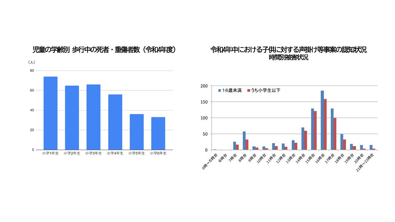 交通事故の発生状況についてのデータによると、子どもの交通事故の死者・重傷者が最も多いのは小学1年生の7歳であることから、“魔の7歳”と呼ばれています。また、子どもが「不審者」など面識のない人物から声をかけられる事案が後を絶たず、下校・帰宅時間帯の午後3~5時台がもっとも多いですが、実は、「社会の監視」が働きやすい午前7~8時台の「登校時間帯」でも発生しています。