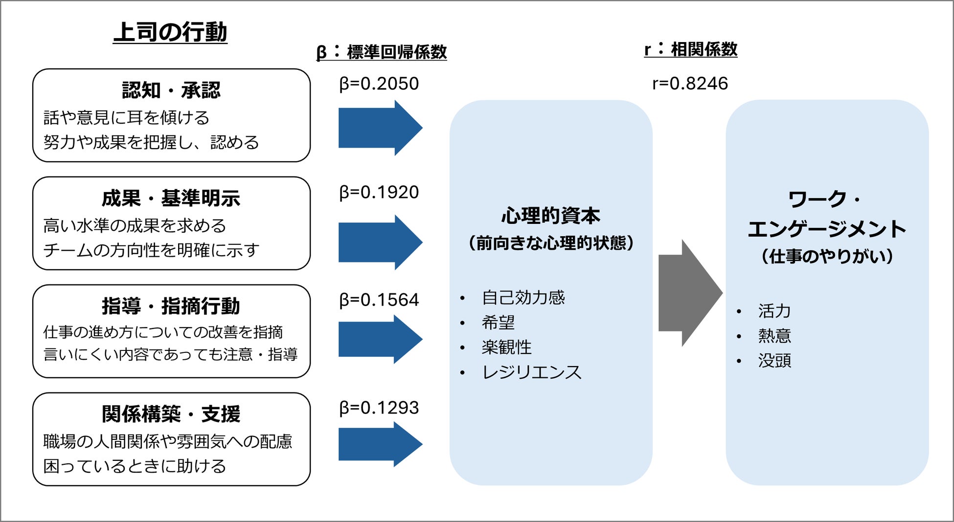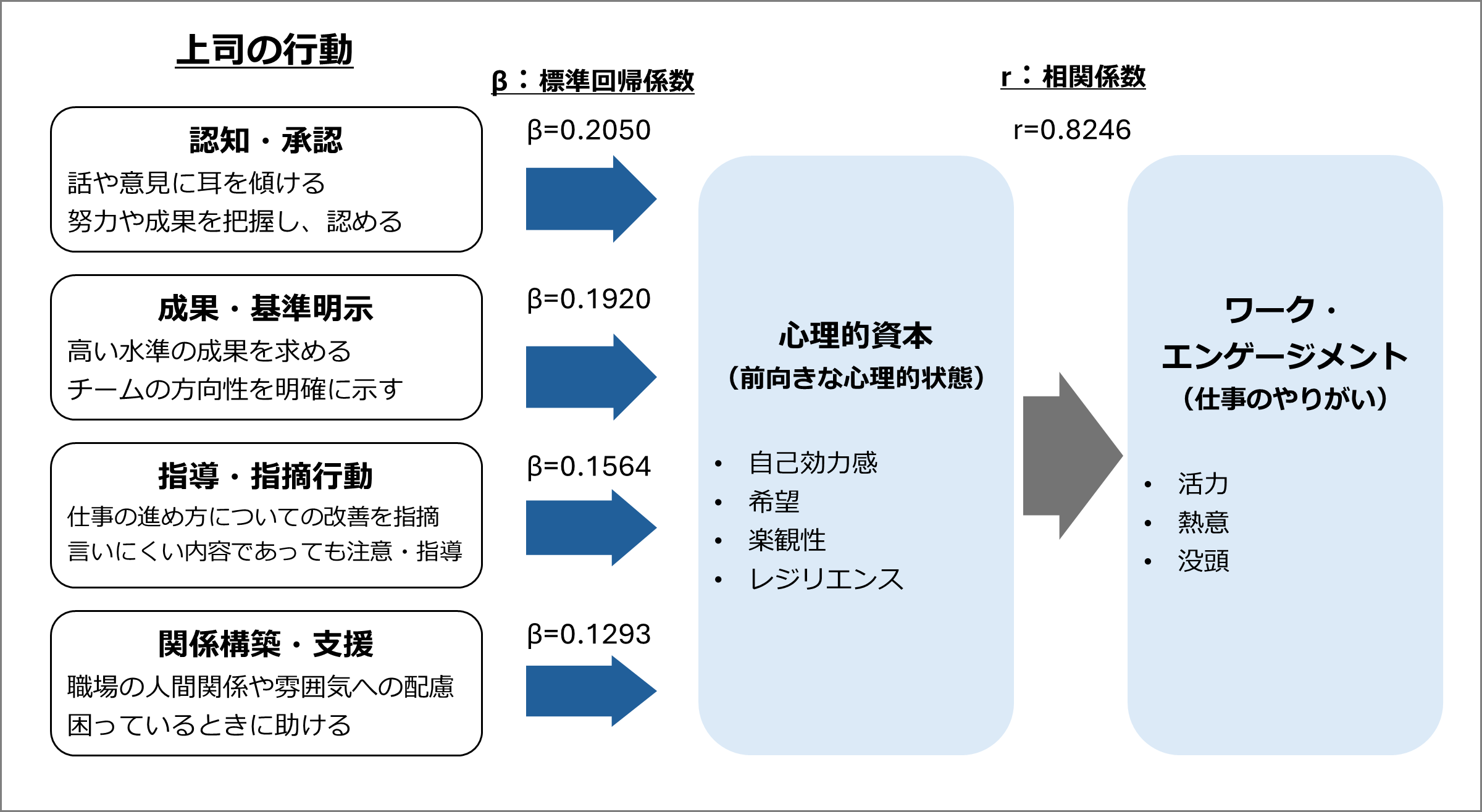 若手社員の前向きな心理状態(心理的資本)と上司の関わり方の関係を明らかにするために、上司行動を「認知・承認」「成果・基準明示」「指導・指摘行動」「関係構築・支援」の4つに分類し、各2設問の平均値を説明変数、心理的資本の平均値を目的変数として重回帰分析を行いました。※3