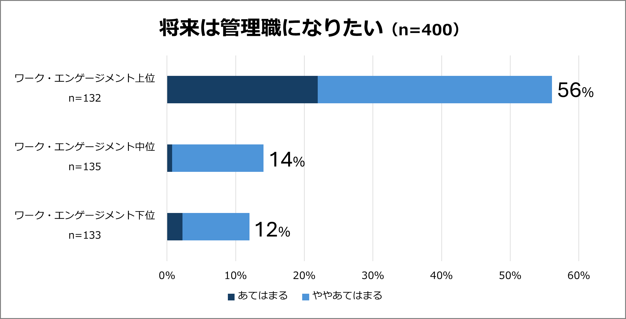 「将来は管理職になりたい」に対して「あてはまる」「ややあてはまる」と回答した割合は、ワーク・エンゲージメント上位では56%であるのに対し、中位14%、下位12%となりました。