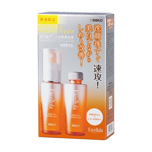 佐藤製薬株式会社(本社:東京都港区、代表取締役社長:佐藤誠一)は、 おとな肌を輝かせる、高保湿・高浸透※2エイジングケア※3ブランド「エクセルーラ」のス ターアイテムである薬用美白※1しわ改善美容液「エクセルーラ ホワイトニング リンクル リペア」(50mL/医薬部外品)に、たっぷりつかえるレフィルが付いたセットを数量限定で発売いたします。