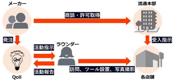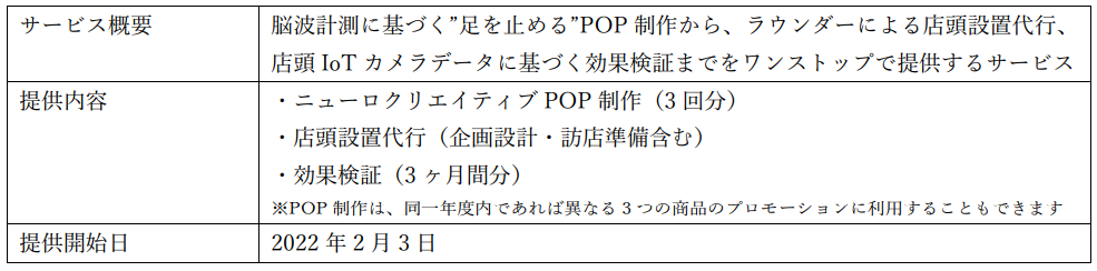 「ニューロクリエイティブ&店頭最適化パック」は、Qoilが株式会社電通サイエンスジャム(本社:東京都港区、代表取締役社長:志村 武彦、以下「電通サイエンスジャム」)と、株式会社ドゥ・ハウス(本社:東京都千代田区、代表取締役社長:小笠原 亨、以下「ドゥ・ハウス」)、FLOWの協力のもと、脳波計測に基づく”足を止める”POP制作から、ラウンダーによる店頭設置代行、店頭IoTカメラのデータに基づく効果検証までをワンストップで提供するサービスです。脳波計測での科学的なクリエイティブ検証には、電通サイエンスジャムの「ニューロアナリティクスソリューション」を活用しています。また、ドゥ・ハウスとのパートナーシップによる設置代行では、ラウンダー※を全国へ派遣の上各個店を巡回し、POPの設置やメンテナンス作業の代行サービスと、設置状況などのレポート提出を行います。FLOWは、POP設置後のPOP前の立ち止まり検知データの計測や、データに基づく効果検証部分で計測・分析技術を提供しています。