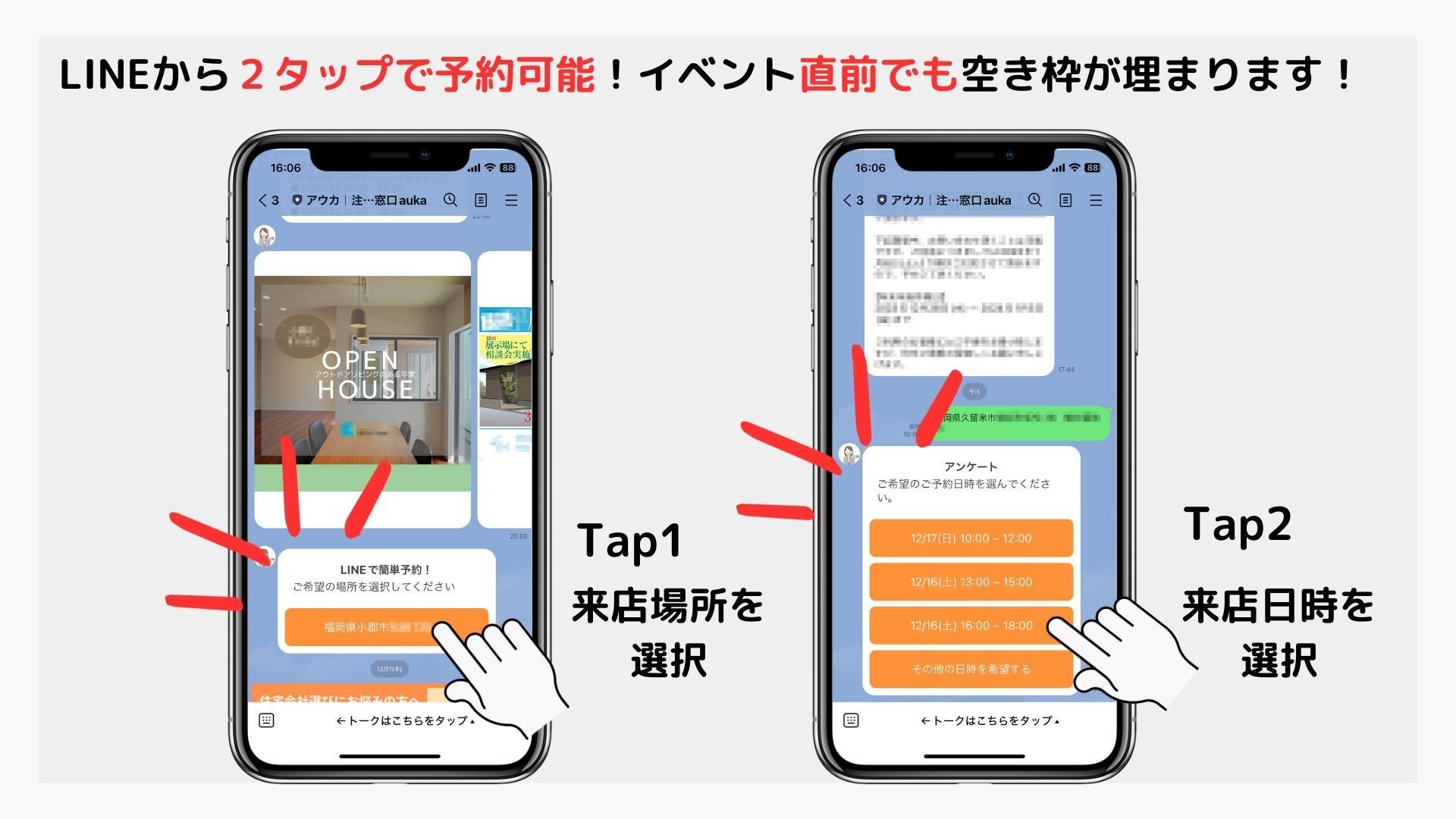 また、一戸建て購入を考える「家を建てたい人」にとっては、予定が空いた時にLINEから2タップで直前でも来場予約することができる利便性が得られ、もっと気軽に家づくりを始めることができるようになります。