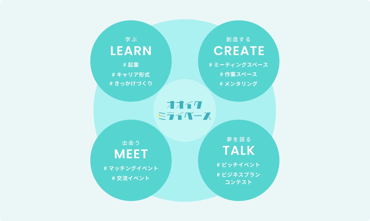 起業に関する知識や起業家としてのマインドセット、キャリア形成等に関する各種イベントやセミナーを通じて、若者が自らの可能性に気づき、行動に移せるような学びの場をつくる。