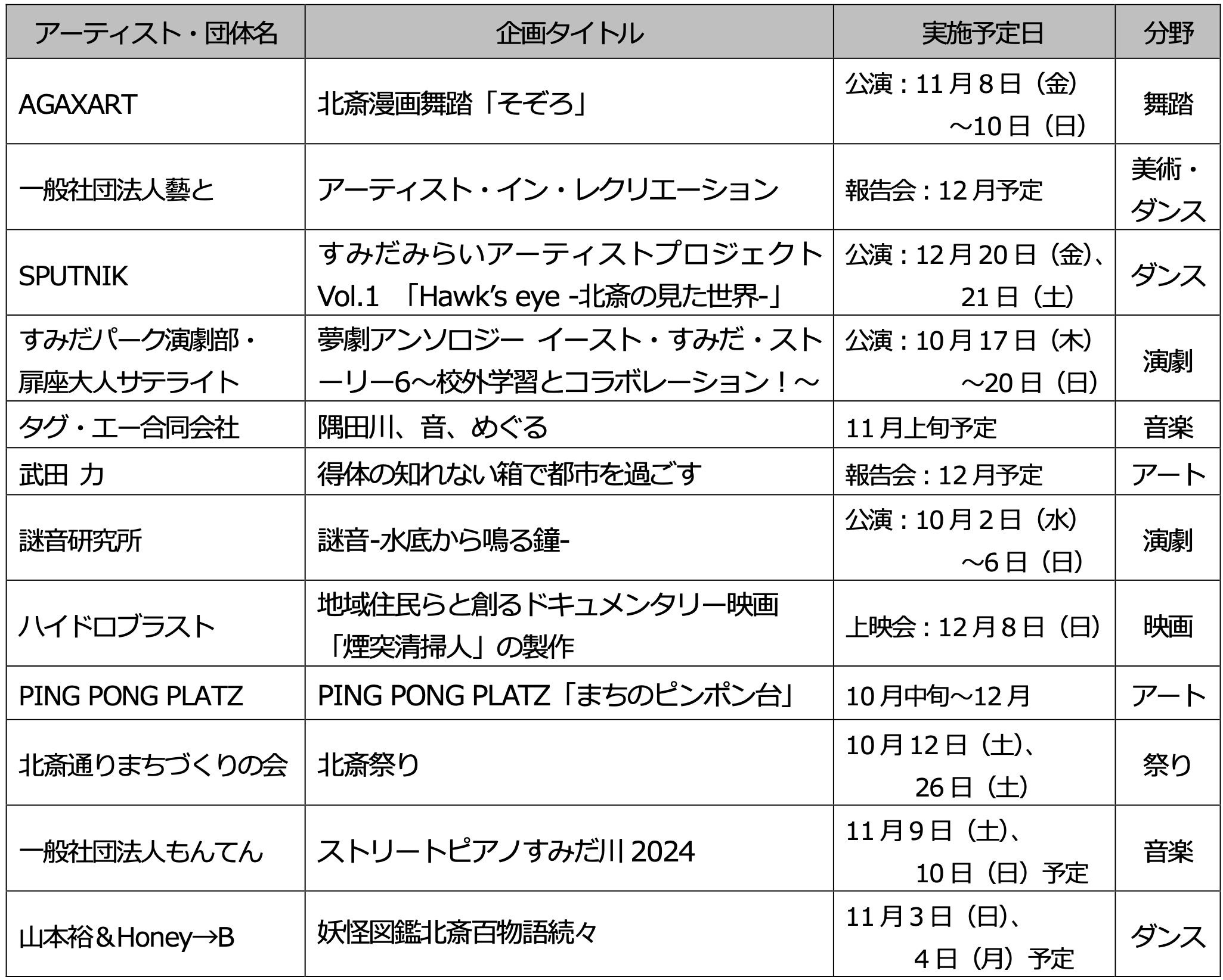 今回から新たに設けられた「特別支援枠」では、企画の新規性及び創造性の観点とあわせて、子どもたちに楽しさや感動を与え、創造力を育む機会を提供する点を評価し、SPUTNIKのすみだみらいアーティストプロジェクトVol.1「Hawk’s eye -北斎の見た世界-」を採択しました。墨田区在住・在学の子どもたち(小学4 年生〜大学生)を「みらいアーティスト」として公募し、北斎が描いた「花鳥図」をモチーフにオリジナルの作品を創作する企画で、墨田区出身のダンサーである吉﨑裕哉が演出・振付を行います。踊りや歌、芝居のようなものまで幅広く、プロのアーティストやスタッフの誘導のもと、参加者のアイデアやコミュニケーションの中から作品を構築していきます。