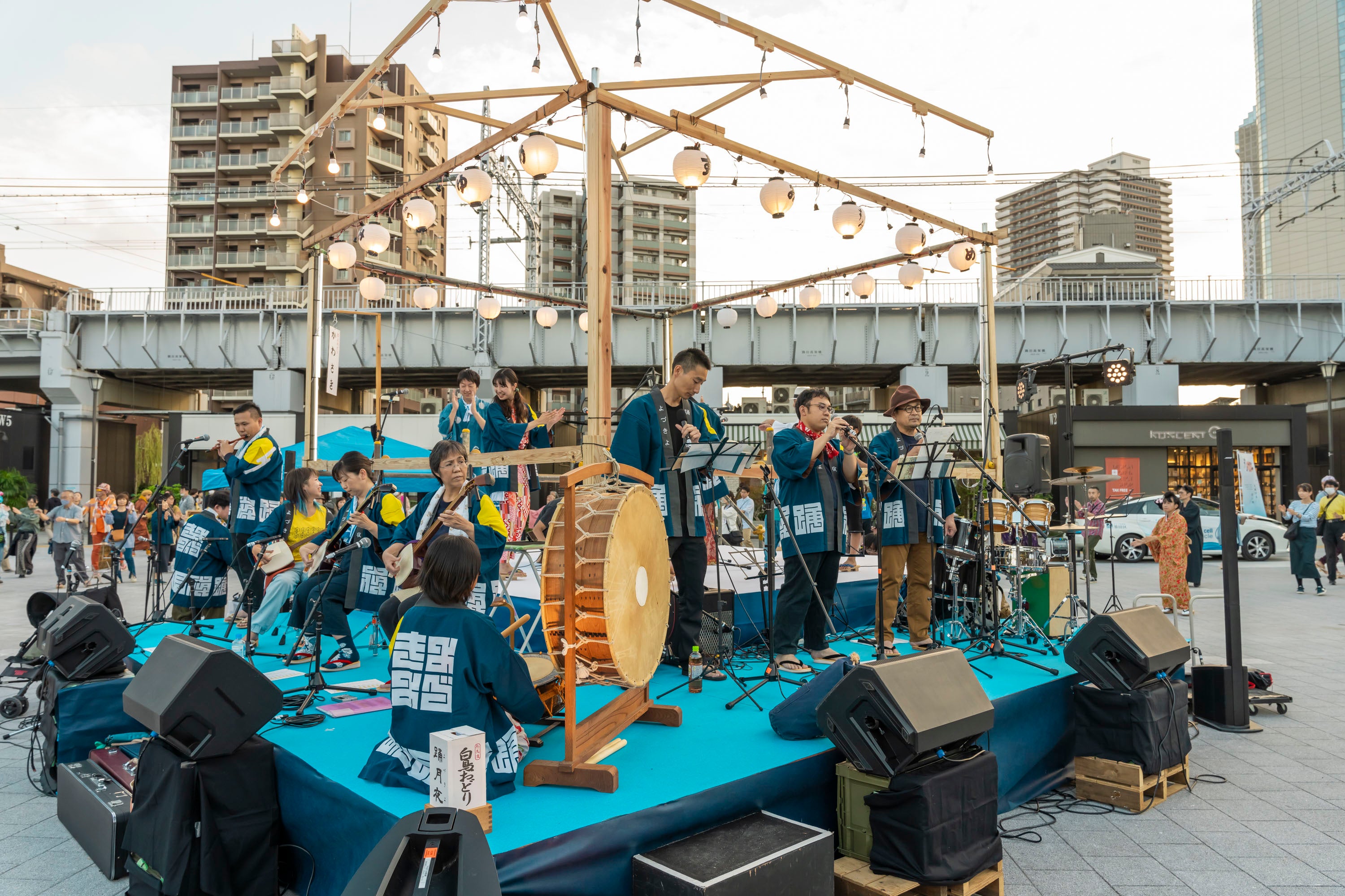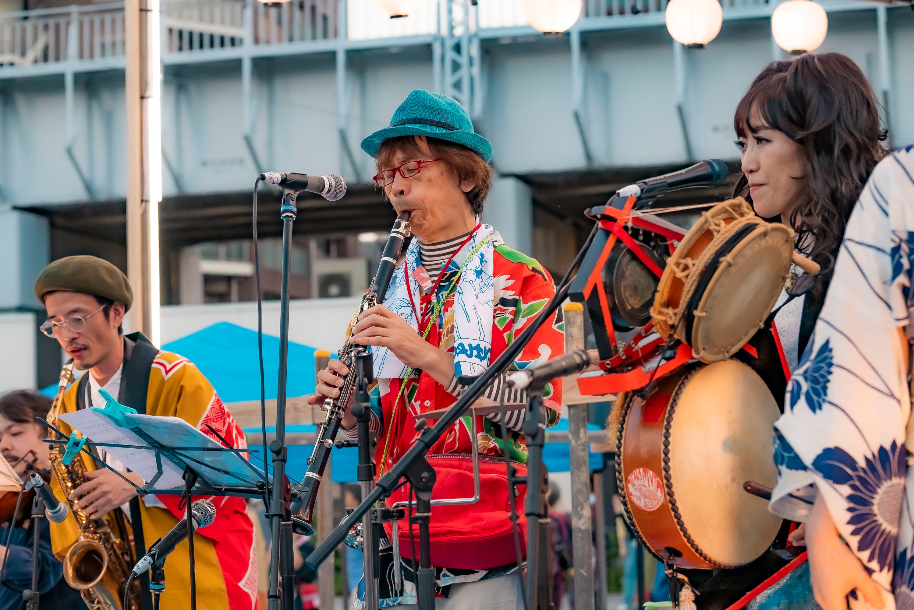 北斎が描いた「踊行列図」をモチーフに、隅田川沿いの隅田公園そよ風ひろばに櫓を設けて、生演奏による盆踊りを中心に繰り広げる「すみゆめ踊行列」。岸野雄一のプロデュースにより、多彩な歌い手と演奏家を迎え、地元の踊り手や芸能団体等を交えて、老若男女、誰もが気軽に参加できるプログラムで構成します。