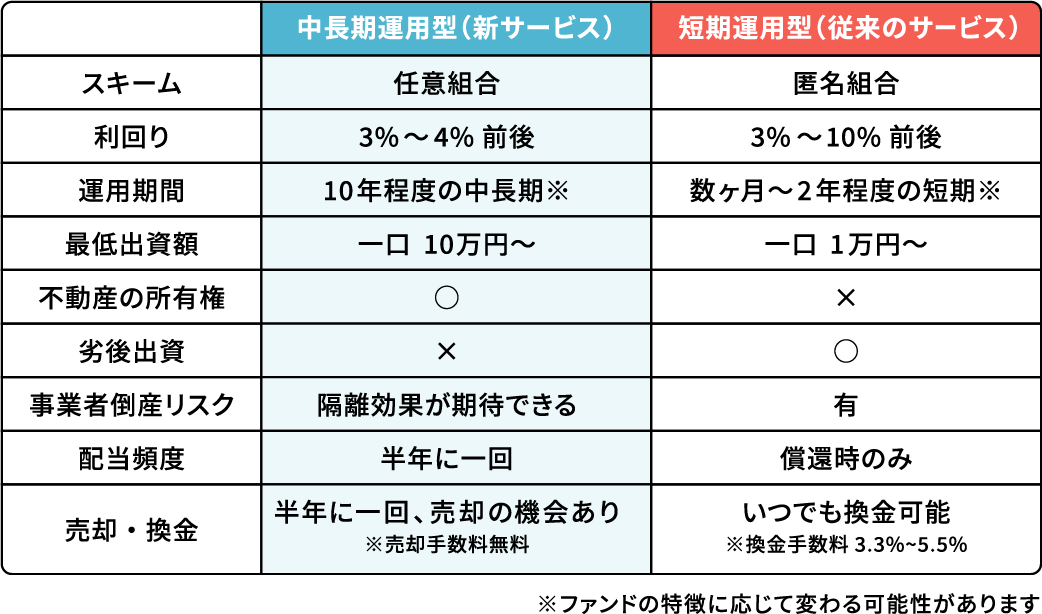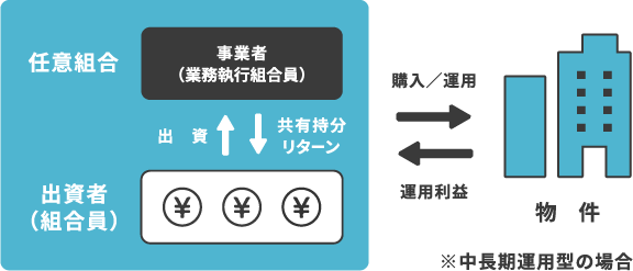 「中長期運用型」は事業者の倒産リスクから隔離効果を得るため、任意組合型のスキームを採用しており、資産として物件を所有している形態に近い投資です。中長期運用型の商品性は、定期的な配当を狙うインカムゲイン重視の物件が中心。一定の流動性を持たせ、日々の値動きを気にせず、債券や銀行預金等より高いリターンを目指します。管理・運用を自身でやる必要はなく、少額から不動産投資をすることができるのが特徴です。