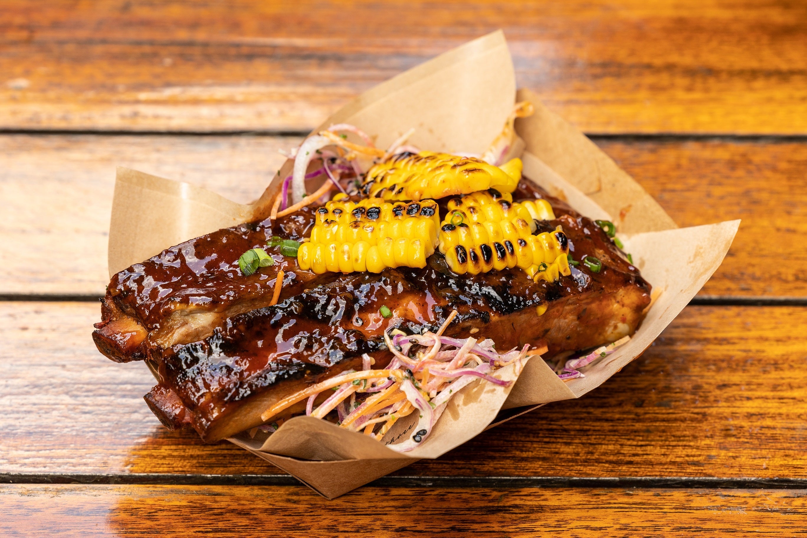 BBQに欠かせないポークスペアリブはセントルイススタイルで余分な脂をトリミング。こんがり焼いたつやつやの骨付き肉を豪快にほおばって。こんがり焼いたトウモロコシが食欲をそそります。