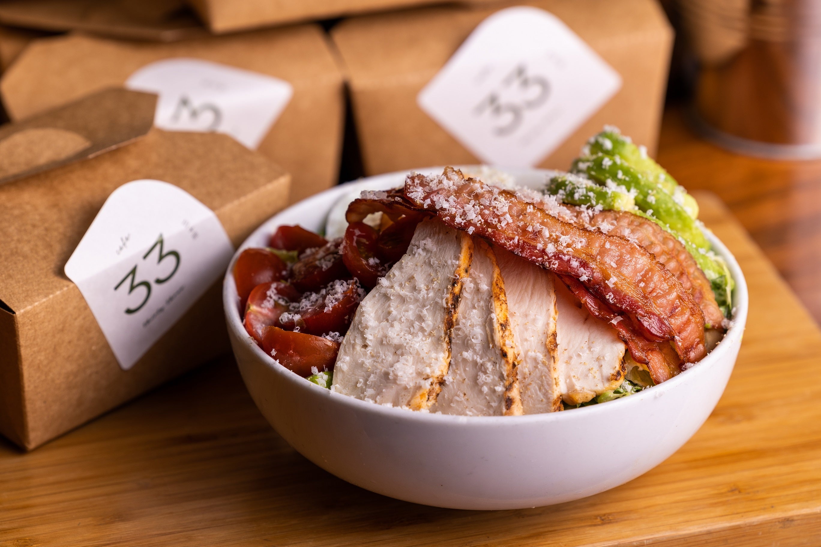 カフェ 33ではシーザーサラダが生まれた時からずっと使われてきたロメインレタスとシーザー・カルディーニのレシピを忠実に再現したドレッシング、カリカリのクルトンに、チキン、ゆで卵、ベーコン、トマト、アボカドをトッピング。