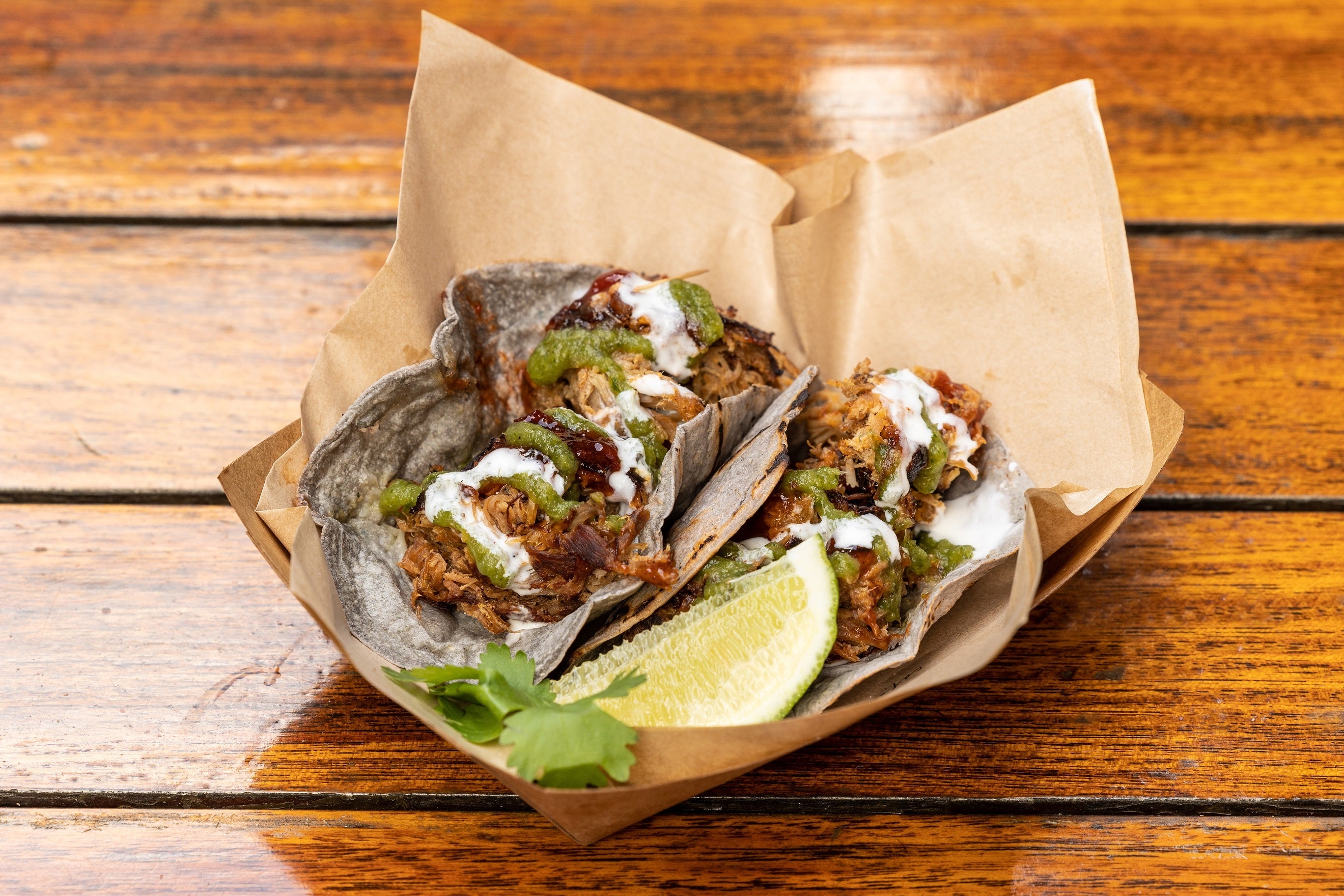 アメリカ・アイオワ州の農場から届けられる黒豚のかたまり肉をほろほろになるまでスモークし、細かくほぐしたプルドポークをブルーコーンタコスに挟みました。鮮やかなグリーントマトのサルサと酸味のあるクリームを合わせて。