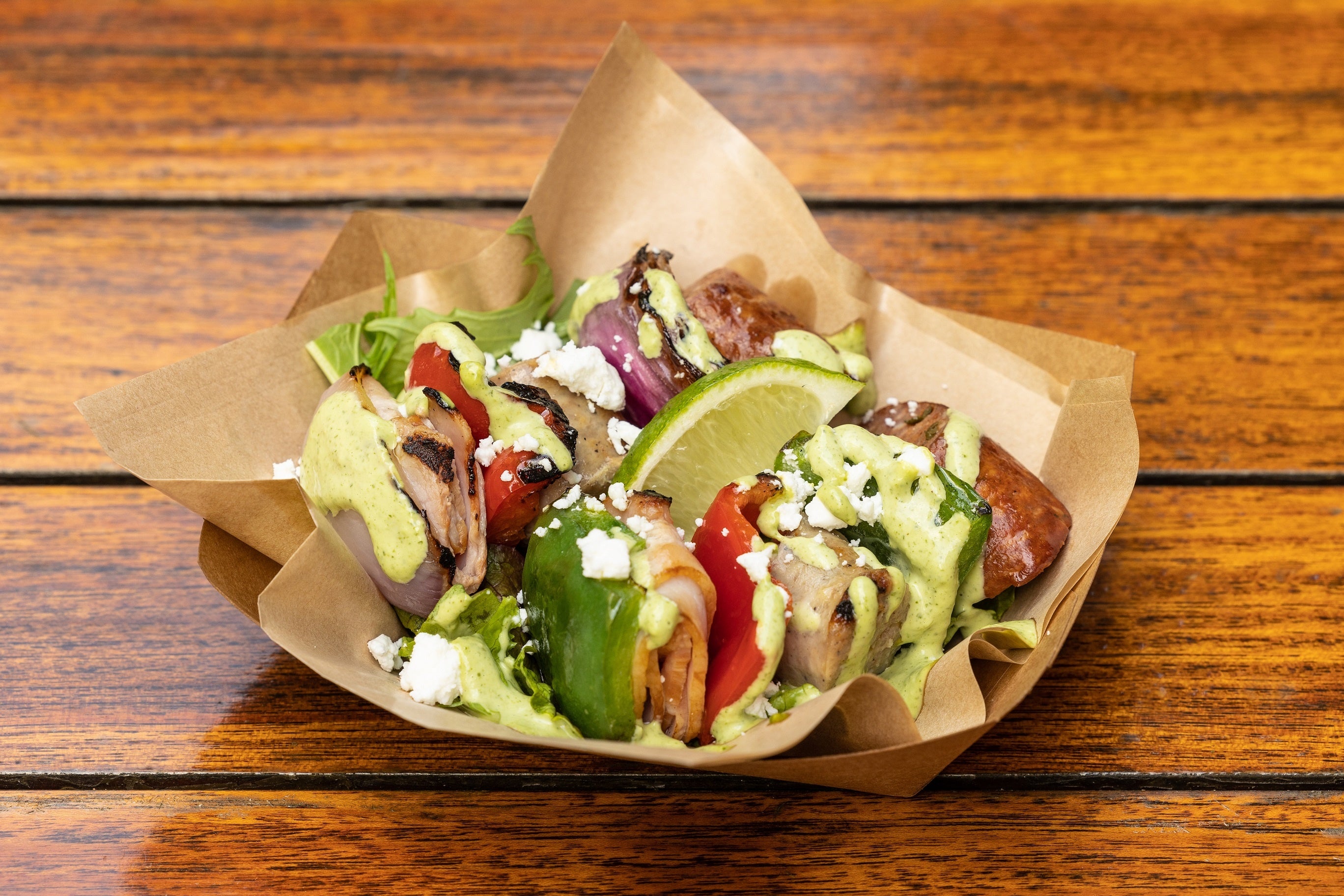 厚く切ったソーセージとベーコンを金串で焼き上げます。仕上げにシープミルクチーズとコリアンダーアイオリでコクと風味をプラス。