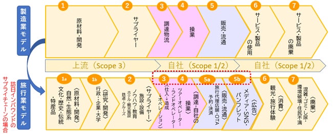 まず、旅行会社には、ツアーオペレーター、旅行代理店、オンライン旅行代理店等、ビジネスモデルが異なる事業体が混在しています。ツアーオペレーターの中には、自社でホテルや航空機等を所有している場合もあります。旅行代理店も、店舗を持つ業態とオンラインの業態に分かれています。そのような状況が、一元的なCO2排出量の算定や推定値の取得を困難なものにしています。また、訪日インバウンドの場合を例にした上記の図からも分かるように、旅行会社はサプライチェーンが広く、どこまでを自社のCO2とするかについても明確にしにくいことがネックとなっています。