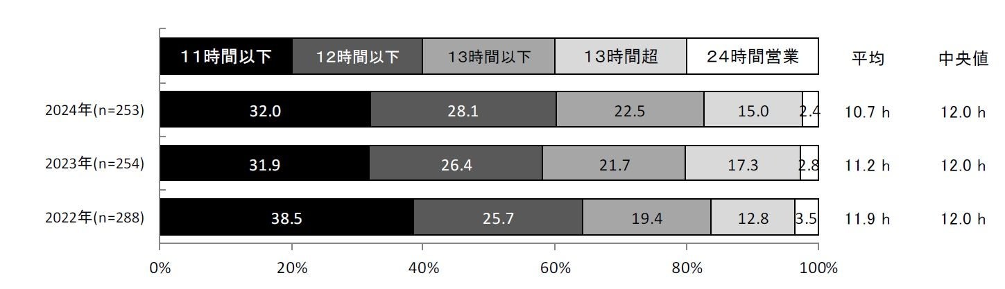 統計調査によると、現在日本全国のスーパーマーケットの営業時間は、「13時間以上+24時間営業」が17.4%、「13時間以下」が22.5%を占めており、合計で約4割が1日の半分以上の時間を店舗営業しています。(※1)