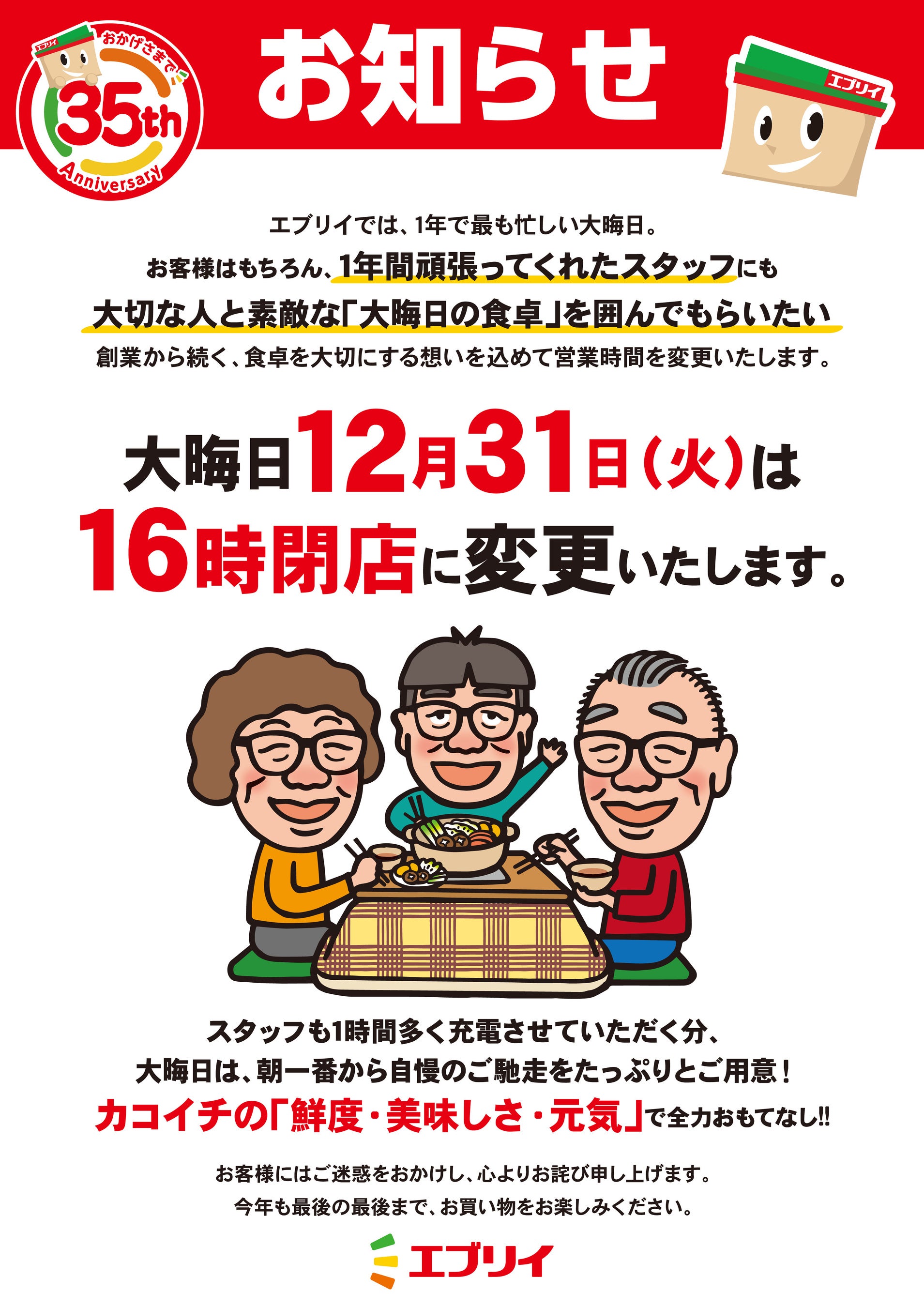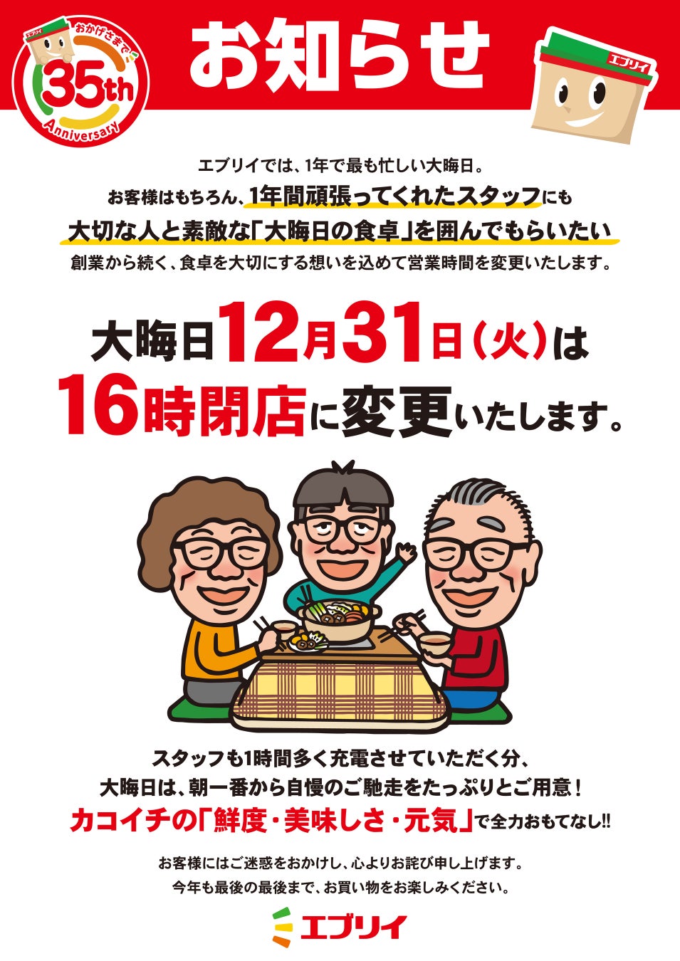 株式会社エブリイでは、12月31日大晦日の店舗閉店時間を「全店16時閉店」といたします。1年の中でも特別な時間である大晦日の食卓をご家族や大切な方と共に過ごしてほしいとの想いから取り組みを実施します。