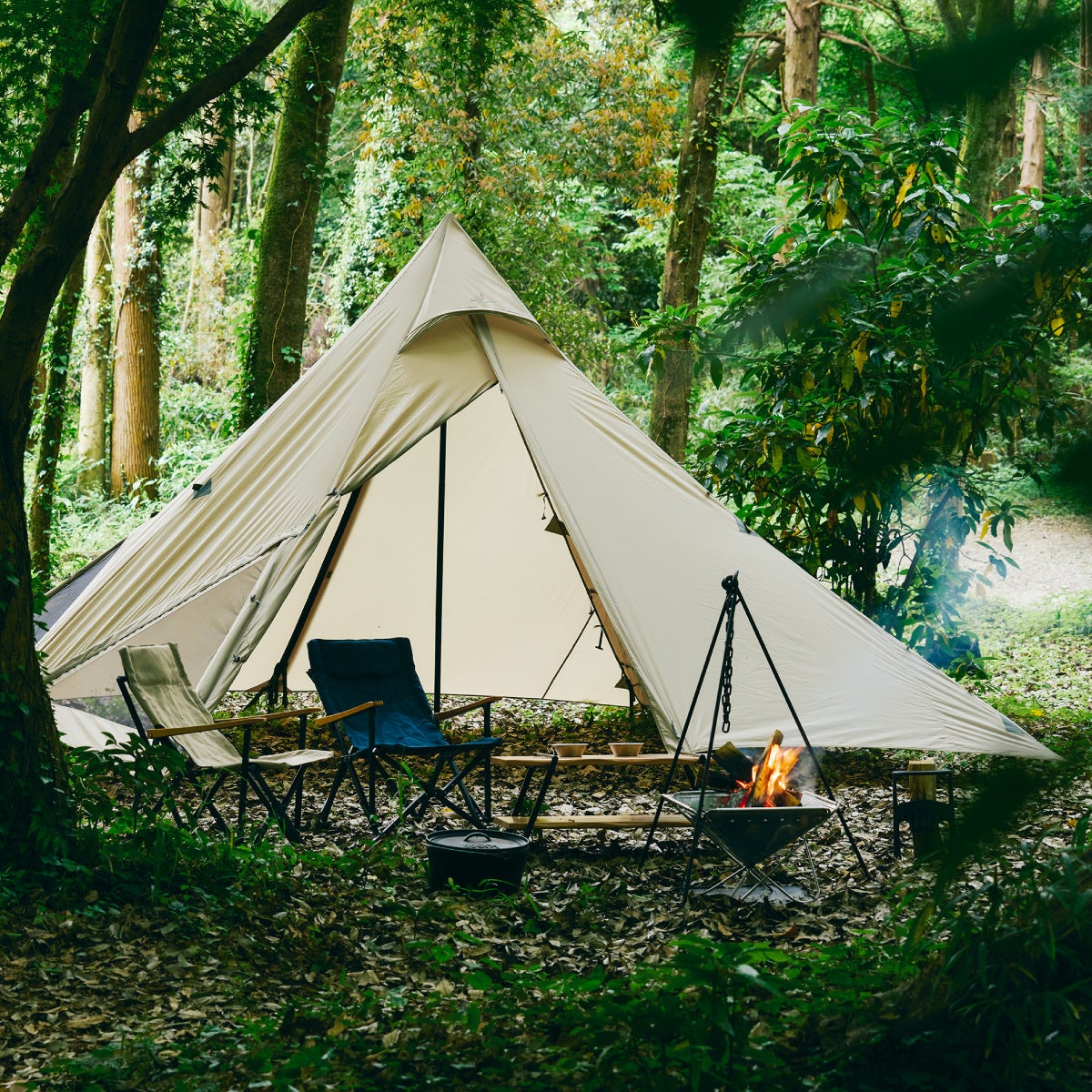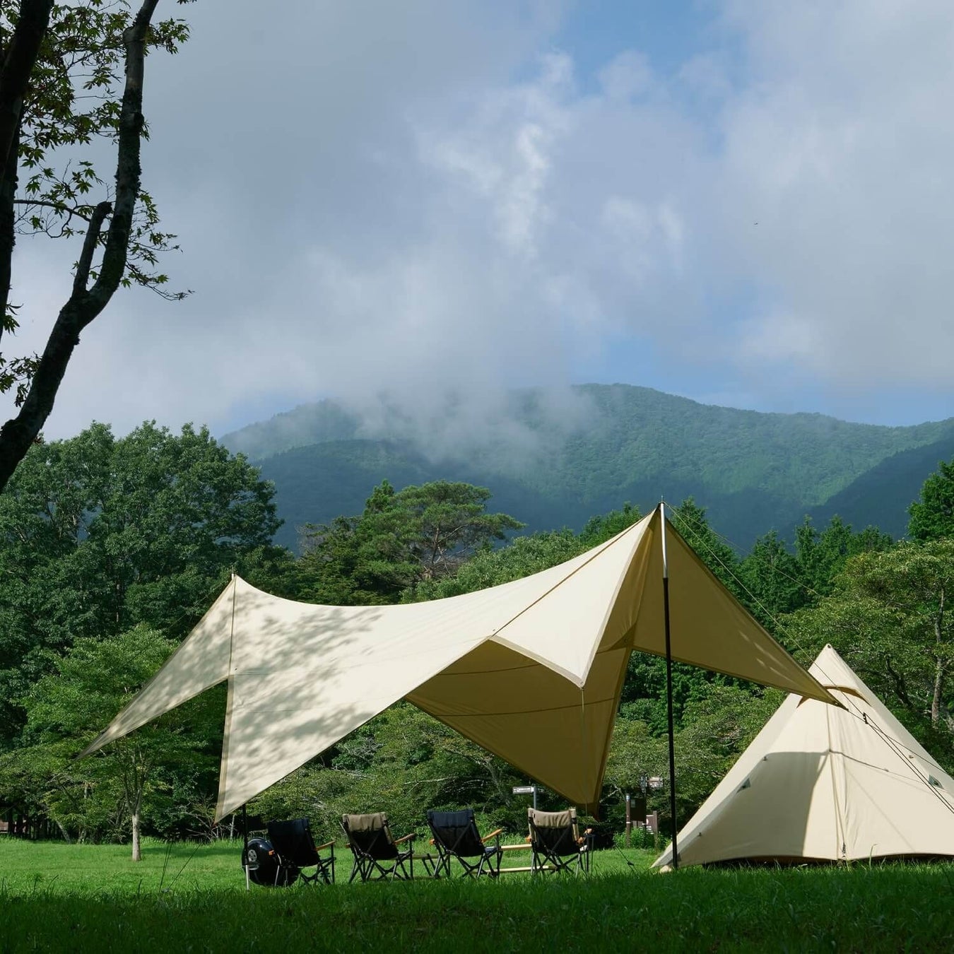 視界の確保とプライバシーを両立させ、パネルの着脱により、一つのタープでシルエットの変化を楽しめるデザインです。