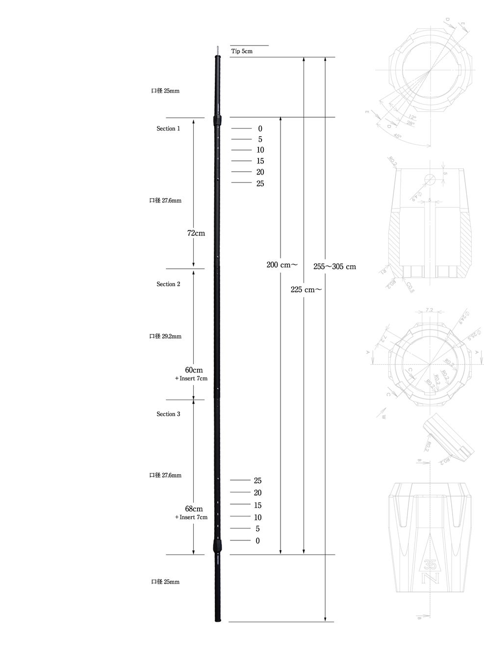 変長できる上下のポールが口径27.6mm(延長部25mm)、応力のかかる中心のポールが口径29.2mmと太めに設計。長さは140~305cmまで調整することが可能です。