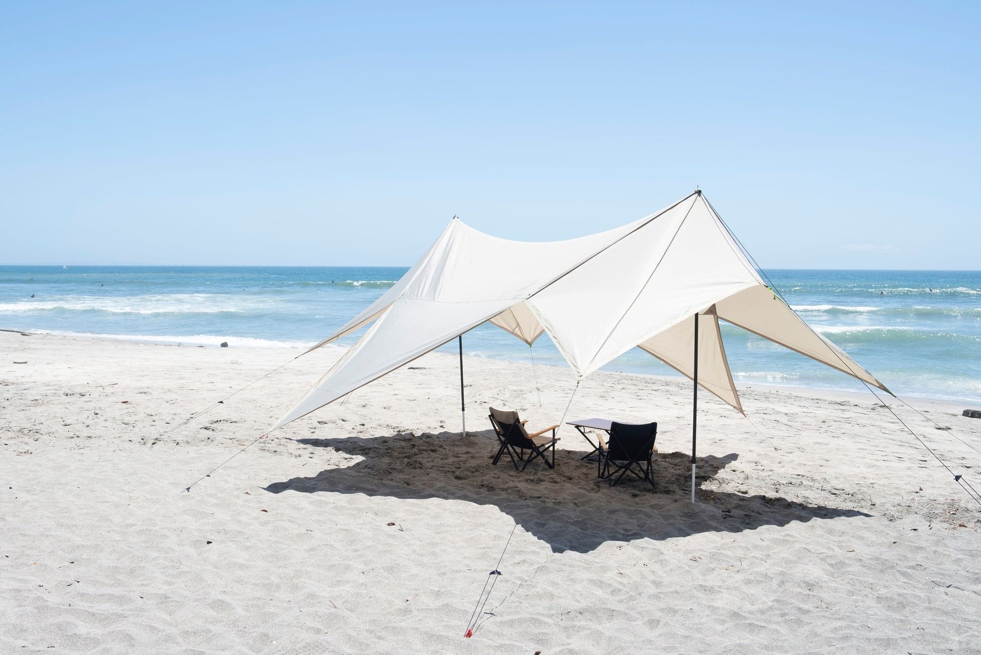 側面の跳上げ時に両サイドのパネルをペグダウンできる機能を採用し、張り方のアレンジがより多彩に。