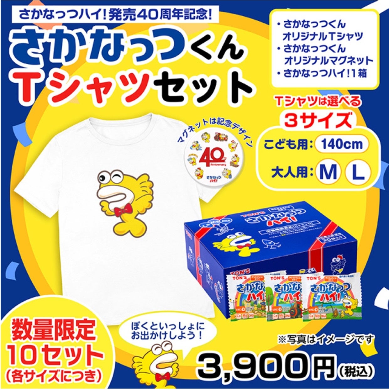 『さかなっつハイ!』1箱(30袋)+オリジナルデザインのTシャツ(1枚)+缶バッジマグネット(1個)が入った、全3種類の「40周年特別セット」をオンラインショップ「よいナッツ屋さん」にて数量限定で発売中です。