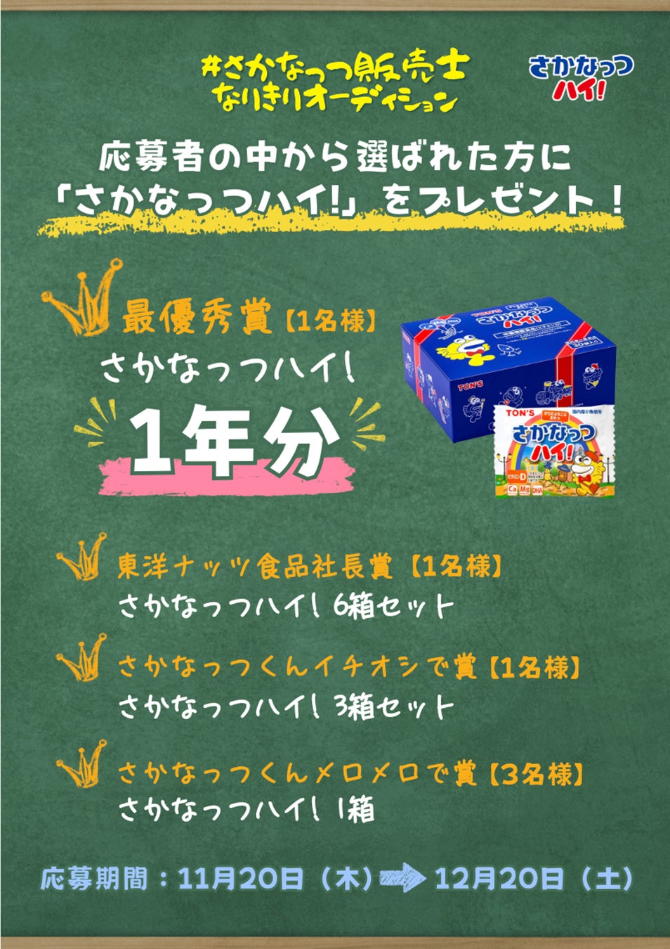 本物の実演販売士のように本格的にプレゼンしても、絵やダンスで表現しても、ストレートに叫んでもOK!販売士になりきっても、全く違う表現でも大歓迎です!あなたなりの動画を投稿してください。投稿者の中から最優秀賞に選ばれた方には『さかなっつハイ!』1年分をプレゼント。そのほかにも「社長賞」「さかなっつくんイチオシで賞」「さかなっつくんメロメロで賞」をご用意しています。