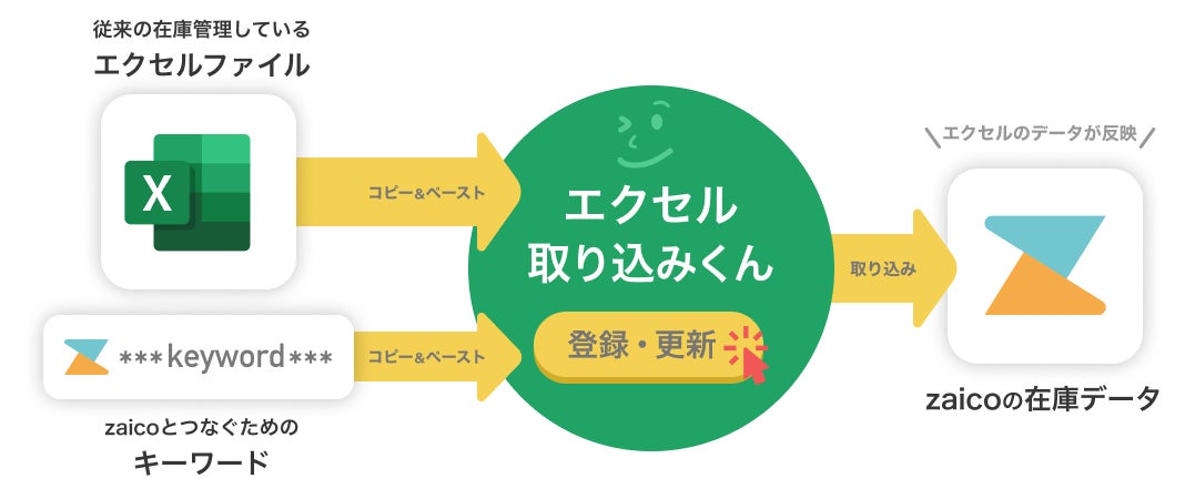 そこでZAICO社は、お使いのExcelのデータをコピーして貼り付けるだけで、そのままそっくりzaicoにデータを移すことができる「エクセル取り込みくん」を開発しました。3ステップでお持ちのExcelデータをzaicoのデータとして登録できます。