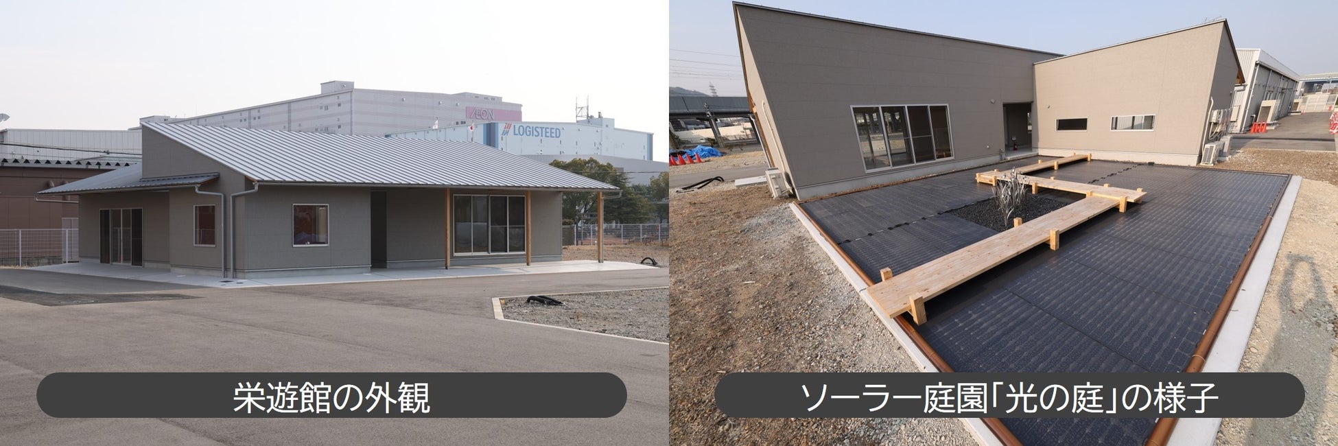 日本庭園(枯山水)という伝統芸術(アート)と、太陽光発電システムというテクノロジーを融合させた庭園で、アート&テクノロジーを具現化した設備となっています。「光の庭」全体のデザインは、いけばな未生流笹岡の御家元である笹岡隆甫先生に手掛けていただき、杜若のオブジェを大阪芸術大学 芸術学部 工芸学科 教授の長谷川政弘先生に制作いただきました。発電した電力は栄遊館で自家消費いたします。
