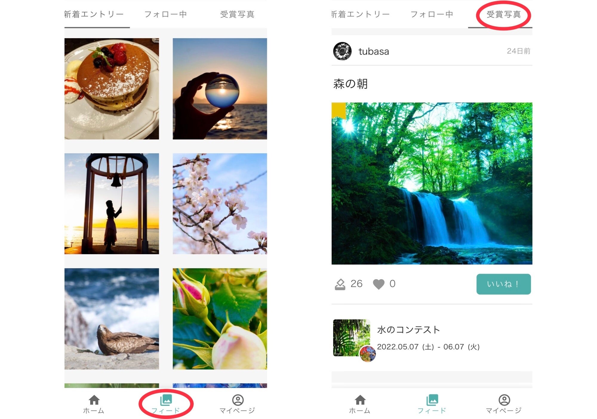フィード画面から、「撮影の参考になる写真」や「お気に入りの写真」を見つけたり、「応援したいフォトグラファー」を見つけて、フォローしてみましょう!