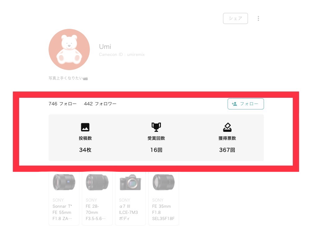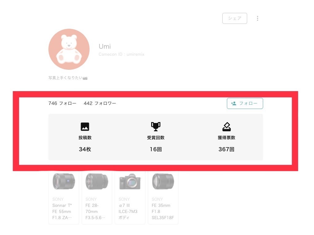 ユーザーがどれくらいCameconで活動しているか、人気があるかの目安になるので、ぜひ気になったフォトグラファーがいたらフォローしてみましょう! また、自身のモチベーションアップのためにも、ぜひぜひいろんなフォトグラファーのユーザーページをチェックしてみてくださいね。