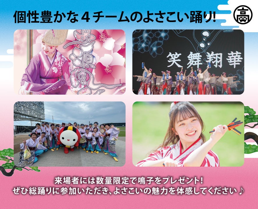 個性豊かな演出で活躍する関西の4つのよさこいチームが多彩な演舞で魅了します。また、よさこいチームが参加者によさこい鳴子踊りをレクチャーし、スペシャルゲストの橘ケンチさんや、よさこいチームと一緒に踊ります。さらに、限定100名様にはよさこいの象徴でもある鳴子をプレゼント!ぜひ鳴子を手に、総踊りにご参加いただき、よさこいの魅力を体感してください。