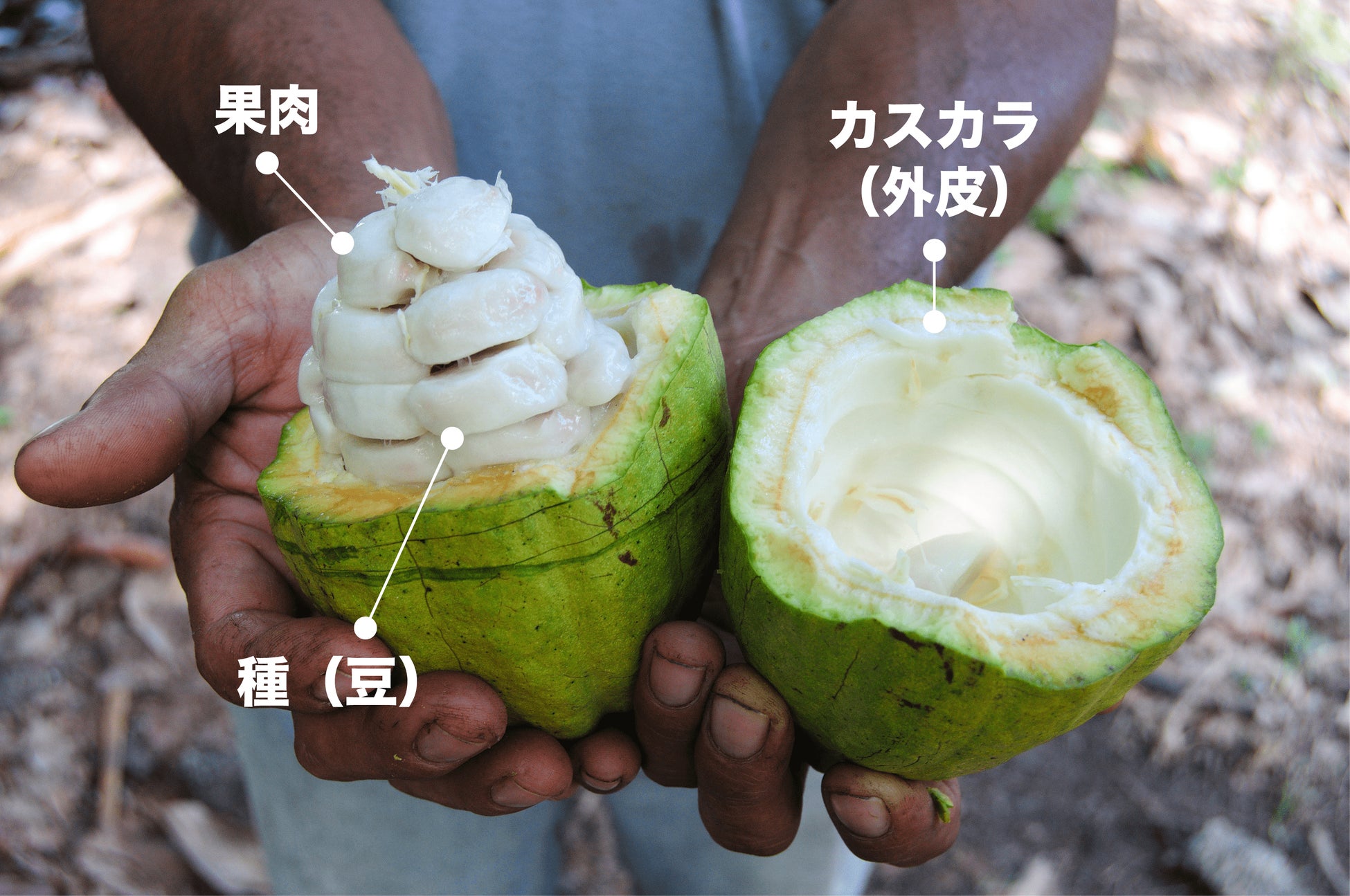 ●チョコレートを製造する際に捨てられていた、カカオフルーツの種(豆)の周りの果肉の部分です。今までチョコレートを製造する際は、カカオフルーツ全体の70%を占める、カカオフルーツパルプ(果肉)、カスカラ(皮)はすべて廃棄されていました。