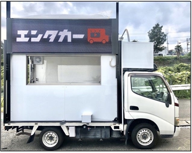 『エンタカー』は、大型LEDサイネージを搭載したキッチンカーを事業者向けにレンタルする事業です。サイネージにより、動画や掲示板として活用でき、顧客への視認性が向上してアピール力が増します。キッチンスペースは汎用性があり、食事や飲料の提供はもちろん、サンプリングやグッズ販売にも活用できます。車の機動性を生かして、準備・撤収の簡素化ができ、巡回型のPR活動やスペース移動なども容易に行えます。