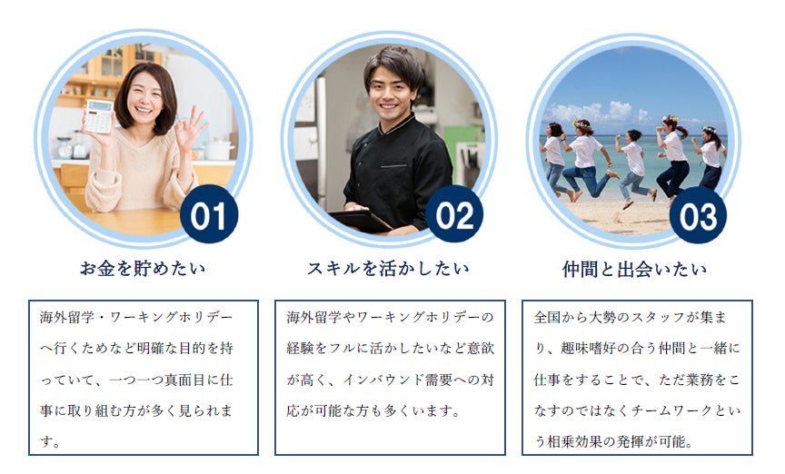 日本全国のホテル・旅館・テーマパークなどのリゾート・観光地へ、基本的には住み込みで働く人材を提供する新しい派遣サービスです。「あのリゾート・観光地で働きたい」「ホテルや旅館でおもてなしを学びたい」「海外留学やワーキングホリデーの経験を活かしたい」「一定期間でお金を貯めたい」など、目的軸で仕事を探す接客経験豊富な派遣キャストを提供します。全国に約40万人いる登録者は事務・コールセンター経験者も多く、フロント・予約事務・裏方業務・調理補助など幅広い業務に対応出来ます。就業開始後は遠隔でのサポートとなりますが、全国にて拠点を展開しているため徹底したフォローが可能で、長期勤務はもちろん正社員登用も視野に入れていただけます。新型コロナウイルス感染症が収束に向かっている中で、今後の国内旅行の事業再開やインバウンドの受入れなどの需要が回復することを見越した新規施策となります。人手不足が深刻な地域への人材供給により観光業復興・地方創生を支援してまいります。