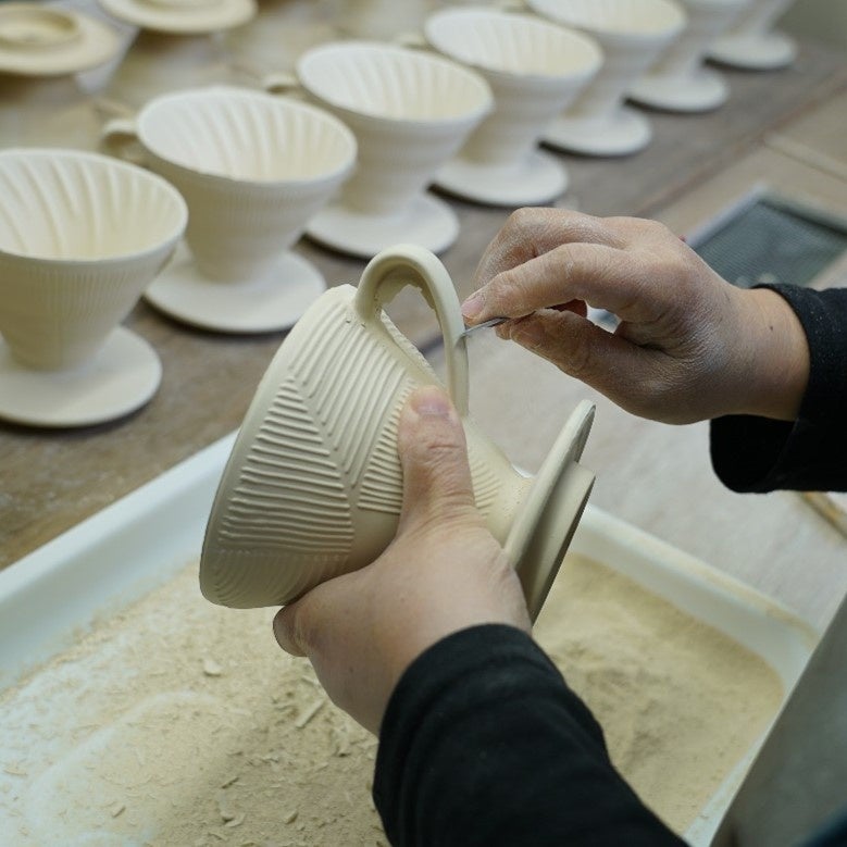 V60独自のフォルムとスパイラルリブ、そしてオールプレスならではのアイコニックで独創的なデザインが職人の技術と融合して完成したHARIO x Allpress V60。11月20日より東京ロースタリー&カフェと虎ノ門カフェ、オンラインストアにてご購入いただけます。