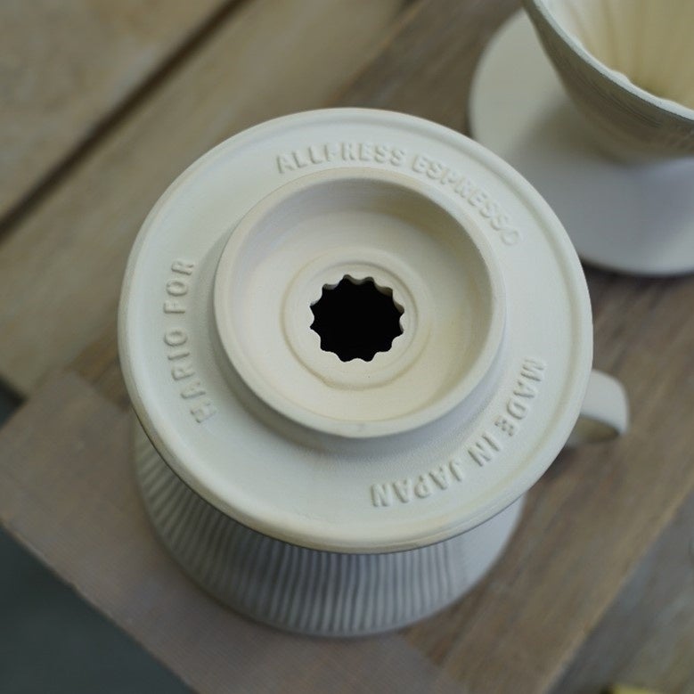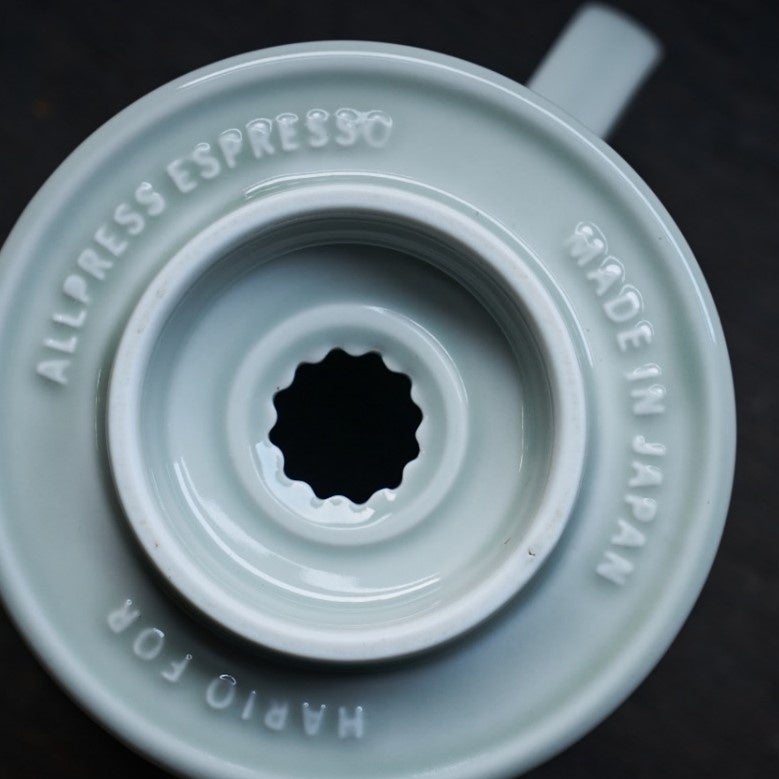 今回のコラボレーションによって誕生した特別モデルのコーヒードリッパー「HARIO x Allpress V60」は、東京ロースタリー&カフェに貼られている淡いタイルの色と、産地で乾燥させたコーヒーからインスピレーションを得て誕生しました。このV60のためだけに作られた型は熟練した技術を持つ職人の手彫りによって鋳造され、側面にはオールプレスのブランドパターン、底面にはロゴが刻まれています。