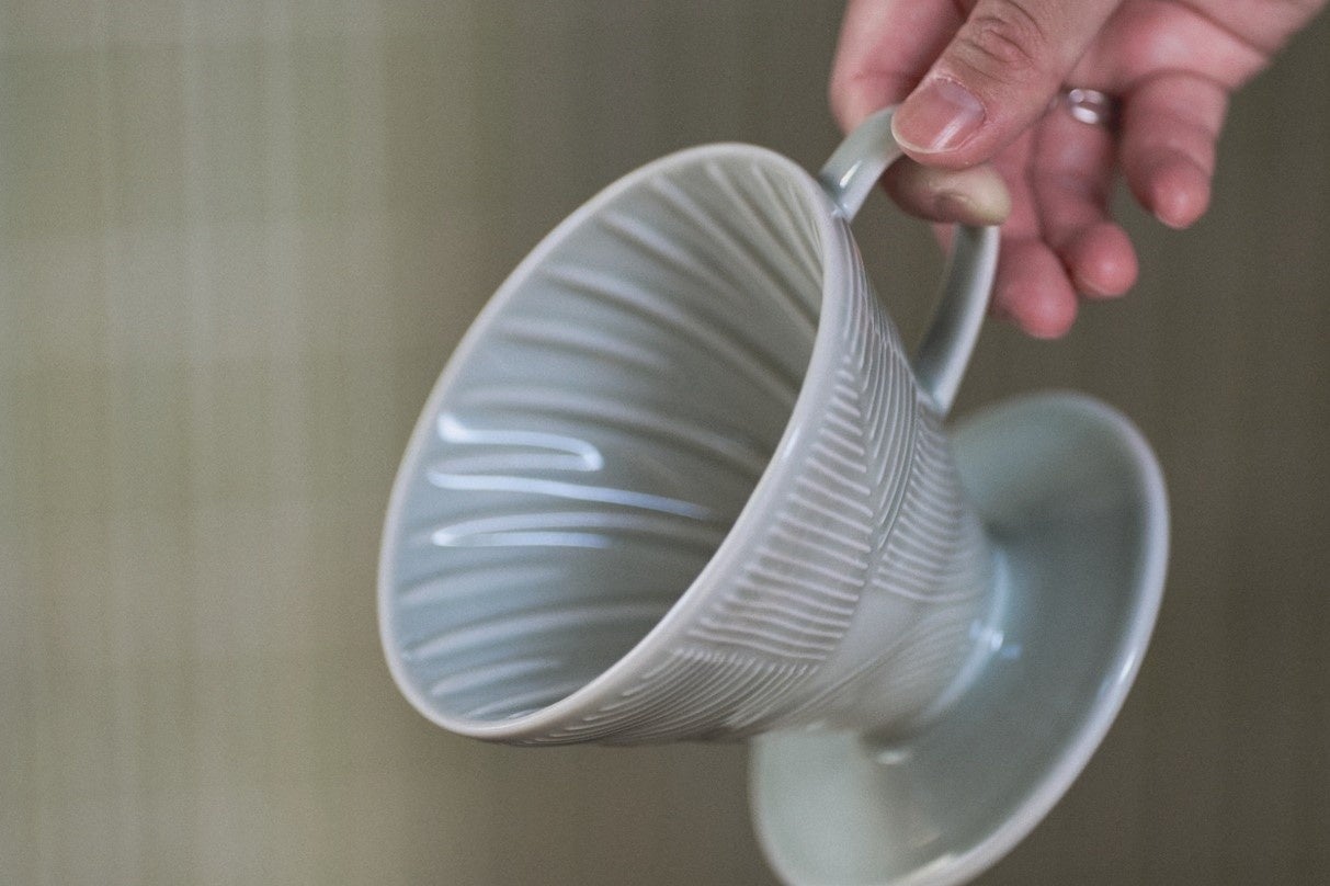 60度の角度で円錐形の「V」の字を描いていることからその名が付けられたV60。その独特のフォルムによって深いコーヒー粉の層ができ、抽出時に中心に向かって流れるお湯がコーヒー粉に長く触れ、コーヒーの成分をより多く引き出すことができるのが特長です。また、ドリッパー内部のリブを高く上部まで伸ばすことでペーパーとドリッパーの間に空間をつくり、蒸らしによるコーヒー粉の膨張を妨げることなく空気がしっかり抜ける構造になっています。