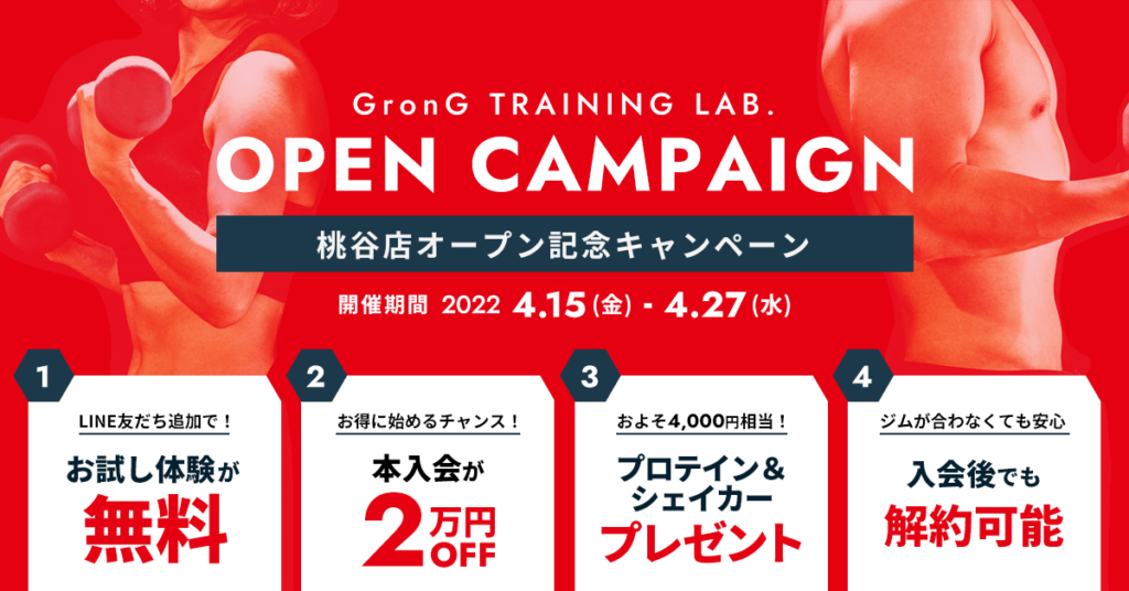 GronG TRAINING LAB. 桃谷店のオープンを記念して、最大26,960円(税込)相当がお得な【30名限定 オープン記念キャンペーン】を開催しています!