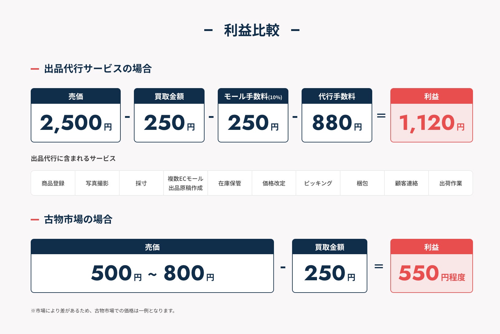800円の中に、EC販売において面倒な、商品登録・写真撮影・採寸・複数ECモール・出品原稿作成・在庫保管・価格改定・ピッキング・梱包・顧客連絡・出荷作業、全ての作業コストを含んでいます。