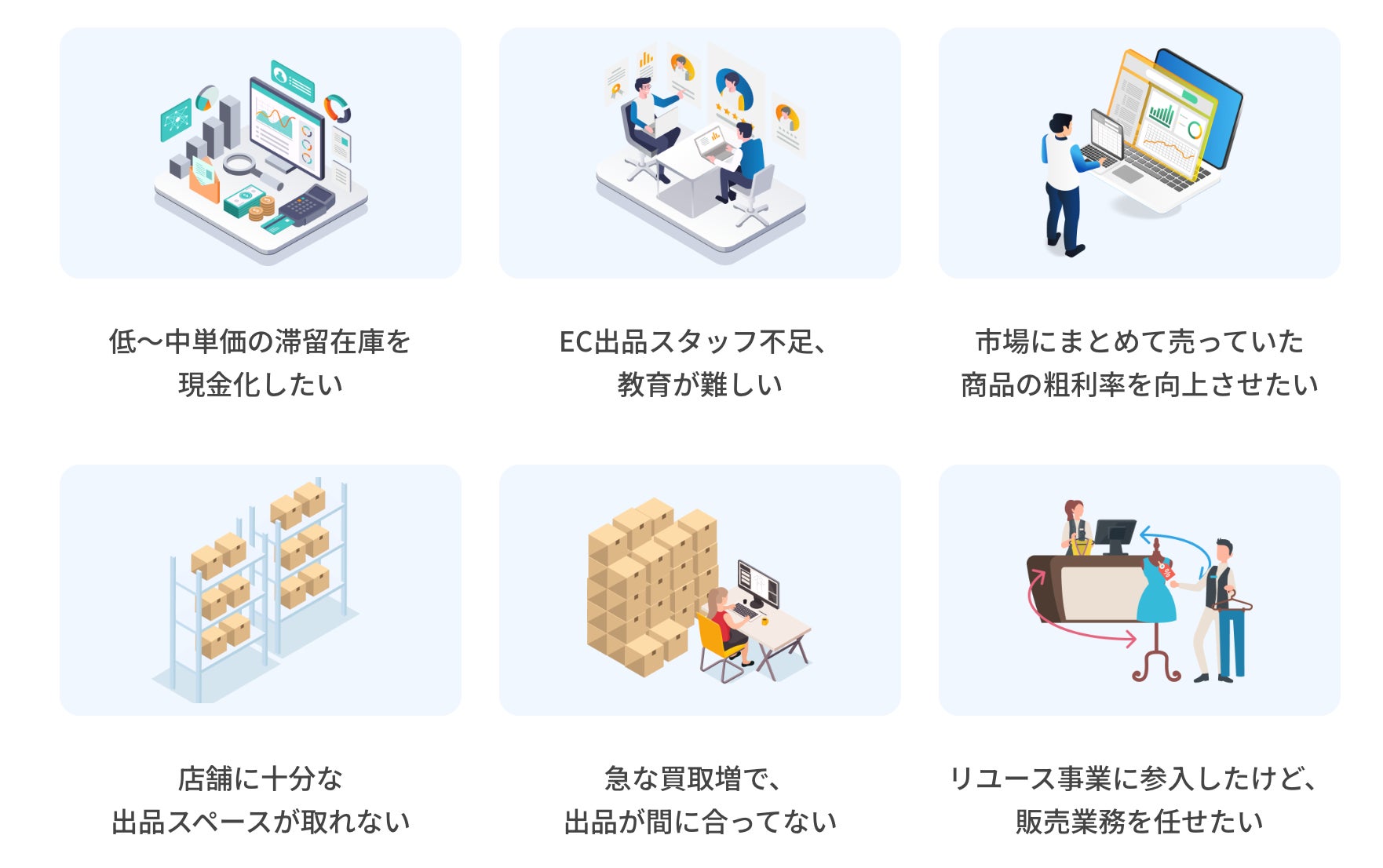 その理由としては、①人材が足りない ②EC出品人材の教育ができない ③急激に増減する買取量に既存人員だけでは賄えない ④店舗の出品環境が十分ではない などが挙げられます。