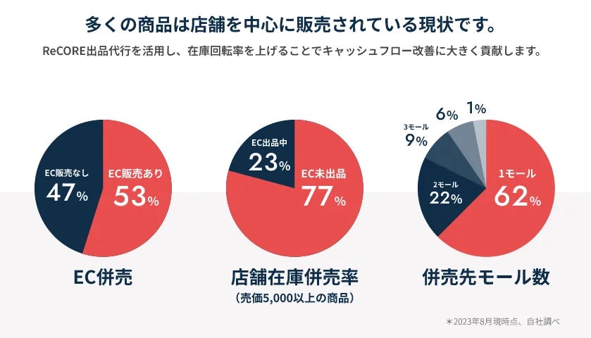 ReCOREのデータを分析したところ、管理している数百億円の在庫のうち【ECに出品されている在庫は全体の2〜3割程度】にとどまっていることが判明しました。