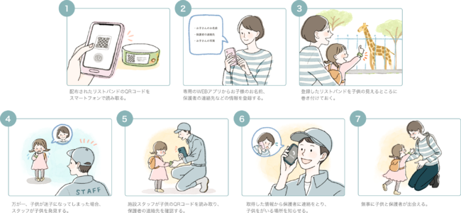 保護者の連絡先が登録されたコード付きのリストバンドをお子様につけておくことで、万が一迷子になった場合でもその登録情報から保護者と素早く連絡を取ることが可能です。また、保護者はスタッフや迷子センターを探さずとも迷子をスタッフに通知することが可能です。