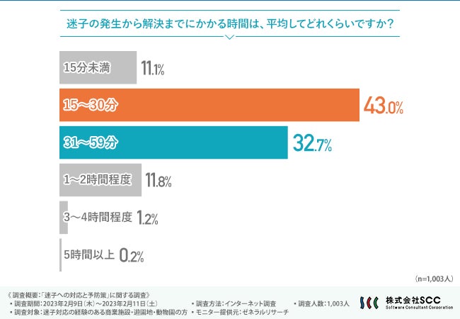 そこで、「迷子の発生から解決までにかかる時間は、平均してどれくらいですか?」と質問したところ、『15分未満(11.1%)』『15~30分(43.0%)』『31~59分(32.7%)』『1〜2時間程度(11.8%)』『3〜4時間程度(1.2%)』『5時間以上(0.2%)』という回答結果になりました。