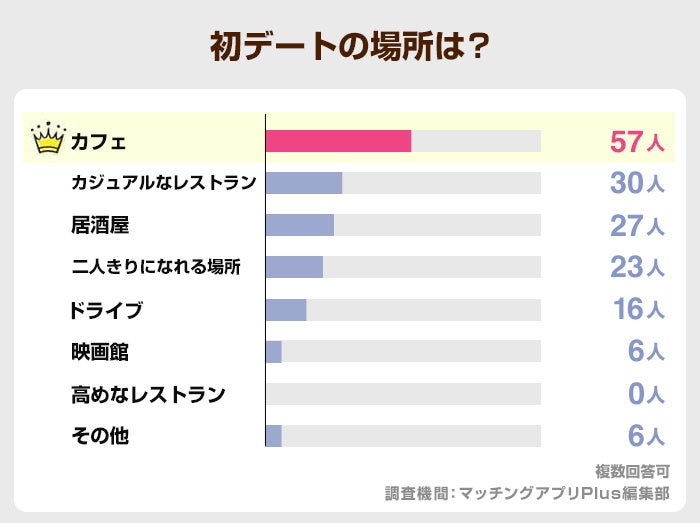 デートで最も多かったのは、53%でカフェでした。居酒屋やカジュアルなレストランも多かったですが、初めての出会いはカフェの方がハードルが低いようです。