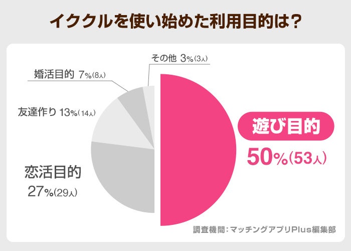 イククルの利用目的を調査した結果、利用者の半数がデートや遊び目的で利用していると判明しました。