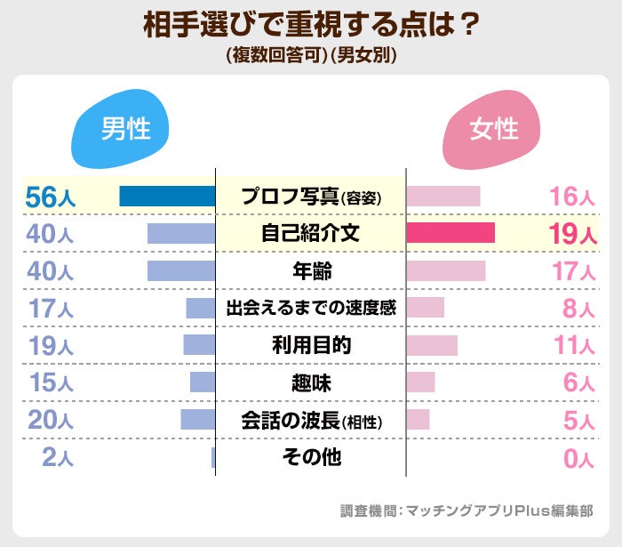 男性は、女性のプロフ写真や容姿を最も重視して相手を選んでる結果でした。