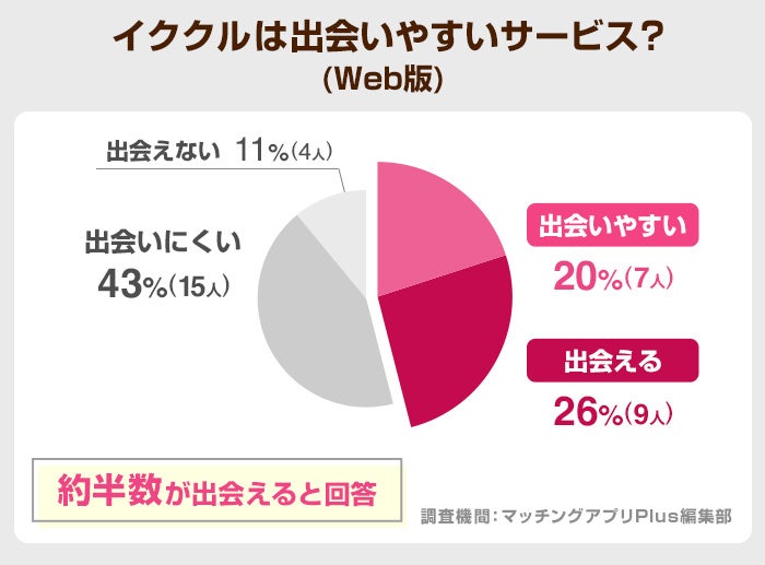 Web版のイククルを利用している46%が出会いやすい、もしくは出会えると回答しています。