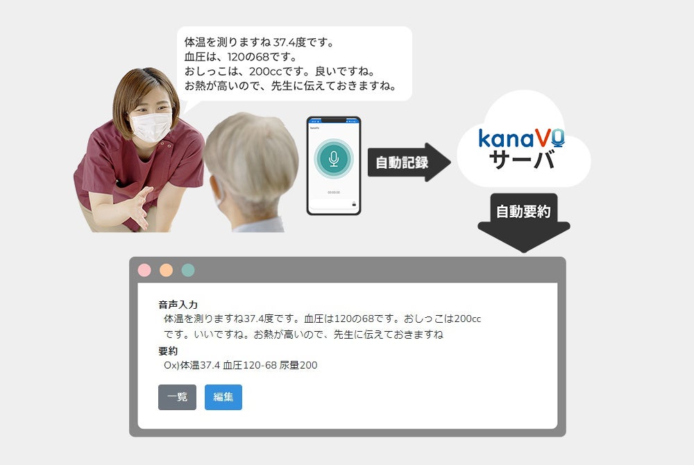 『kanaVo mobile』は、音声操作によって患者のバイタルや状態などを自動で記録・要約するラウンドのための音声認識ツールです。スマートフォンで『kanaVo mobile』を起動すると、患者と看護師の会話を自動的に取得。弊社が開発した音声認識ツール『kanaVo』が自動で体温や心拍といったバイタルの結果を要約します。要約した結果はkanaVoのサーバ上に保存され、ラウンド終了後に看護師自ら認識結果データを一覧で確認することができます。要約データは看護師が自由に編集することが可能になっているため、適宜編集して看護日誌や電子カルテに転記することができます。