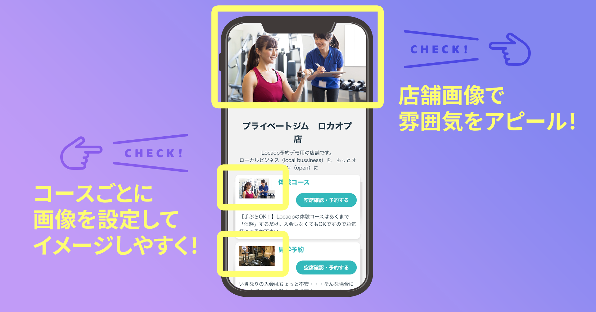 これまでのLocaop予約では店舗ロゴの設定が可能でした。それに加えて店舗やコースの画像を設定ができるようになりました。これにより、ビジュアルで店舗の雰囲気やコースの内容をアピールでき、より内容をイメージしやすくなりました。