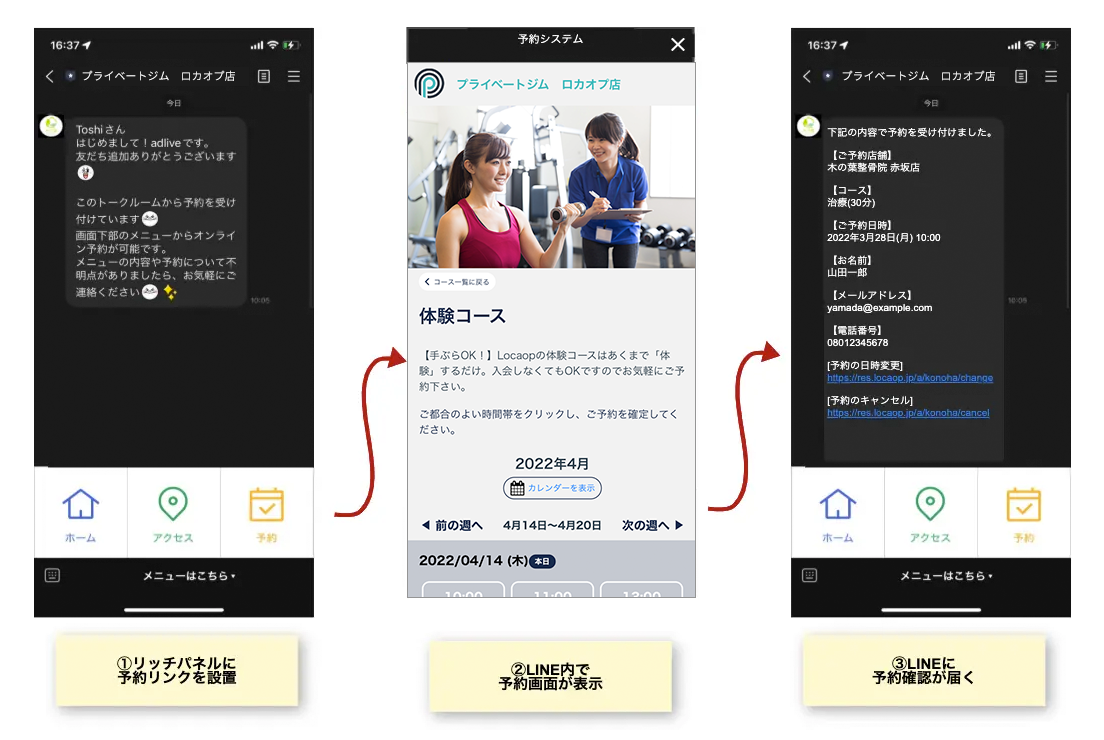 LINE公式アカウントからスムーズな予約導線を作成することができます。予約変更、キャンセルもLINEから実行でき、リマインダもLINEでメッセージとして通知可能です。