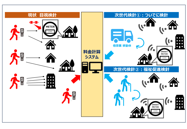 現在、水道事業体で行っている検針は、検針員が水道使用者の居所に設置されている水道メーターの目視確認により水道使用量のデータを収集する直読式がとられております。この方式は検針員が確保できる水道事業体にとっては今後の継続も可能な方式となりますが、人口減少が進む日本においては、十分な検針員を確保することが困難になっている水道事業体が少なくありません。このような検針員不足に対応する最良の手段として水道スマートメーターが挙げられ、数多くの事業体で導入の検討が急ピッチで進められております。