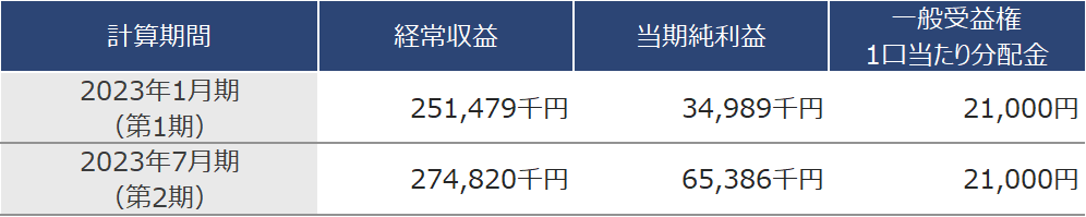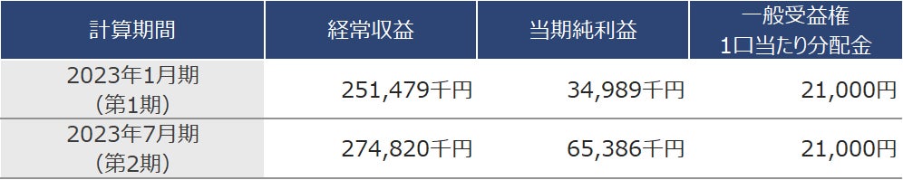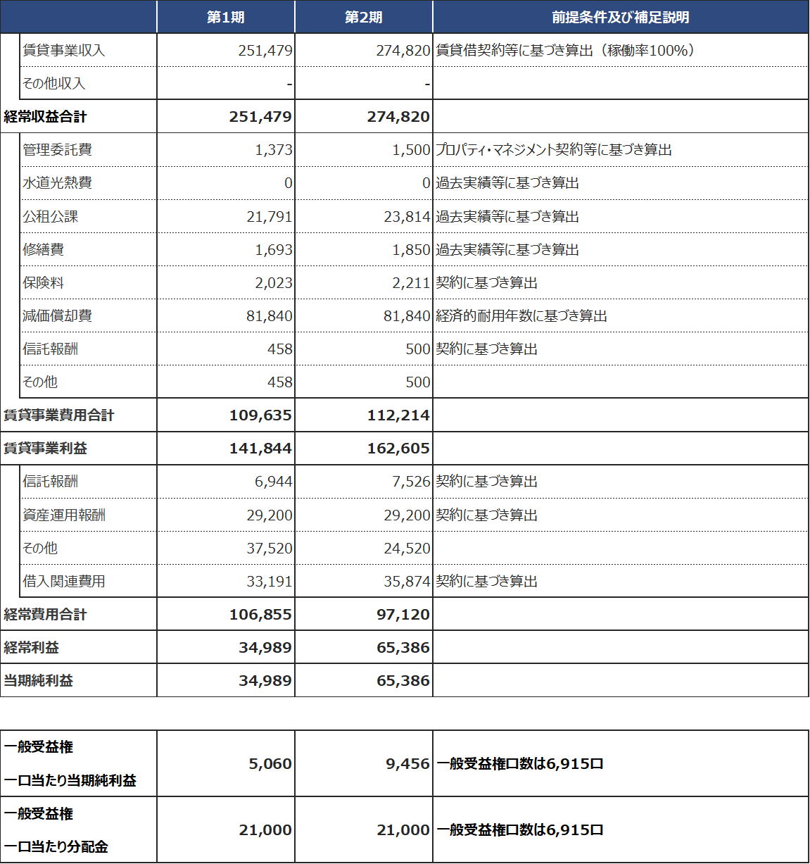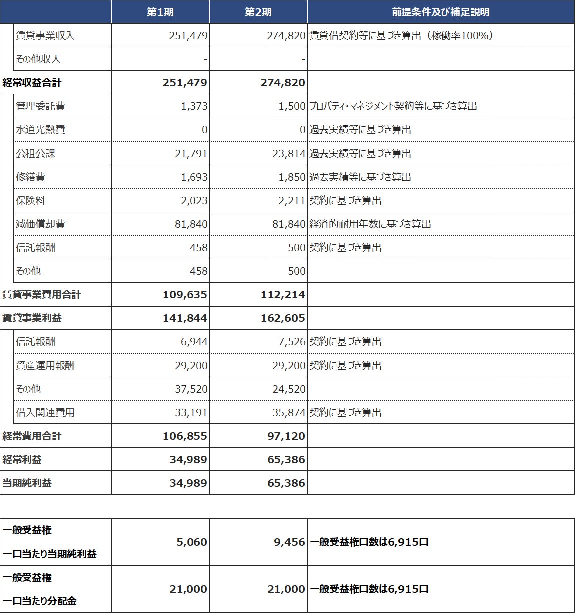 ご注意:本資料に記載されている予想数値は、一定の前提条件のもとに算出した現時点の見込額であり、今後の賃借人の経営状況・財務状態の変動若しくは賃借人の異動等に伴う賃料収入の変動、予期せぬ修繕の発生等運用環境の変化、火災や災害等の発生により物件の状況の変化又は金利の変動等状況の変化により、前提条件との間に差異が生じ、その結果、収益及び分配金は大きく変動する可能性があり、その金額を保証するものではありません。また、本資料に記載されている予想期間及び以降の期間における分配金を保証するものではありません。