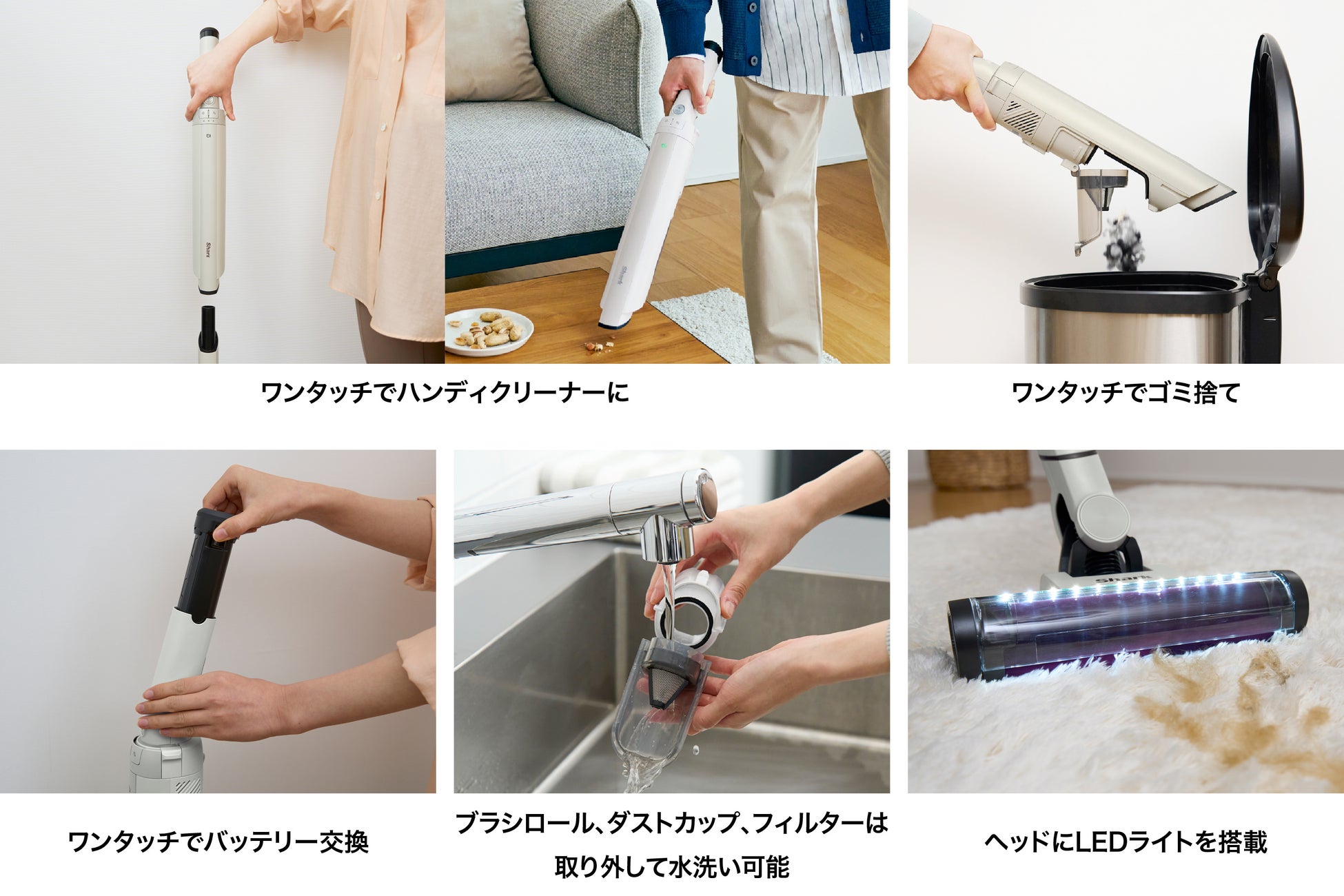 片手でリリースボタンをつまむだけで強力なハンディクリーナーに変身し、家具上や狭い場所のお掃除も、気づいた時にサッと取ってサッと使えます。また、ボタンを押すだけでワンタッチで簡単にゴミ捨ても行えて、ゴミに触らなくていいので衛生的です。